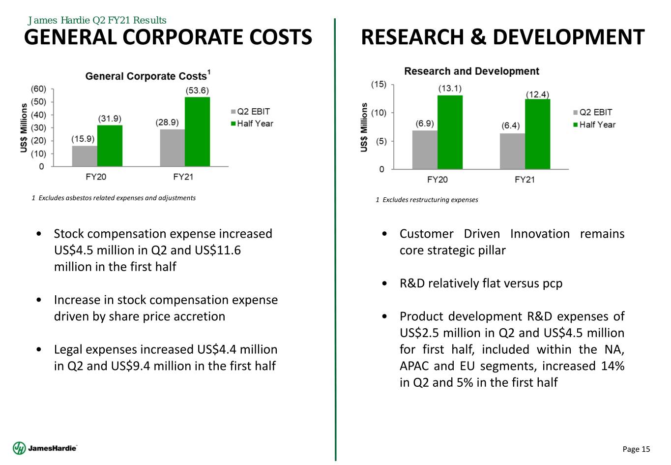 James Hardie Q2 FY21 Results GENERAL CORPORATE COSTS RESEARCH & DEVELOPMENT 1 Excludes asbestos related expenses and adjustments 1 Excludes restructuring expenses • Stock compensation expense increased • Customer Driven Innovation remains US$4.5 million in Q2 and US$11.6 core strategic pillar million in the first half • R&D relatively flat versus pcp • Increase in stock compensation expense driven by share price accretion • Product development R&D expenses of US$2.5 million in Q2 and US$4.5 million • Legal expenses increased US$4.4 million for first half, included within the NA, in Q2 and US$9.4 million in the first half APAC and EU segments, increased 14% in Q2 and 5% in the first half Page 15