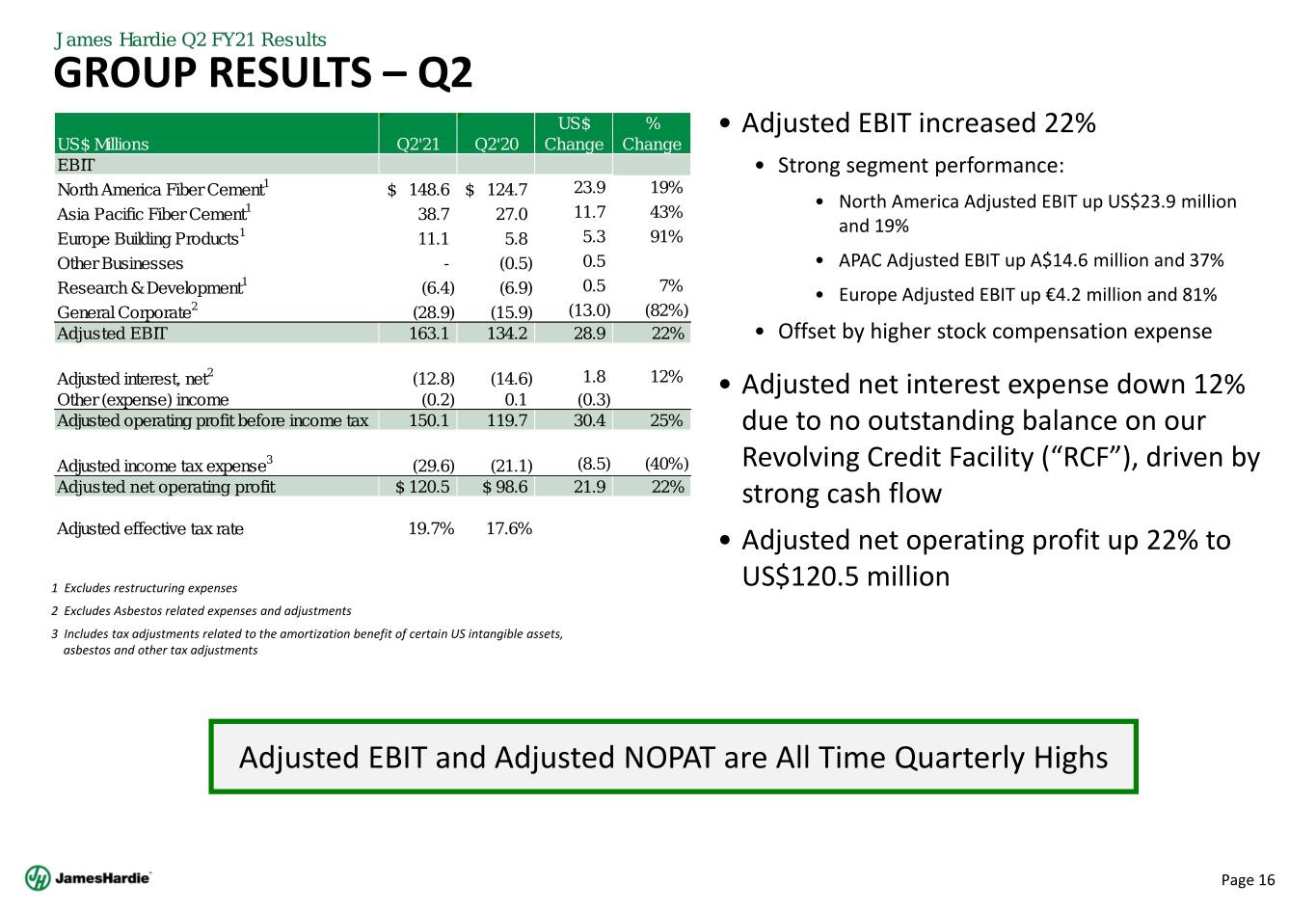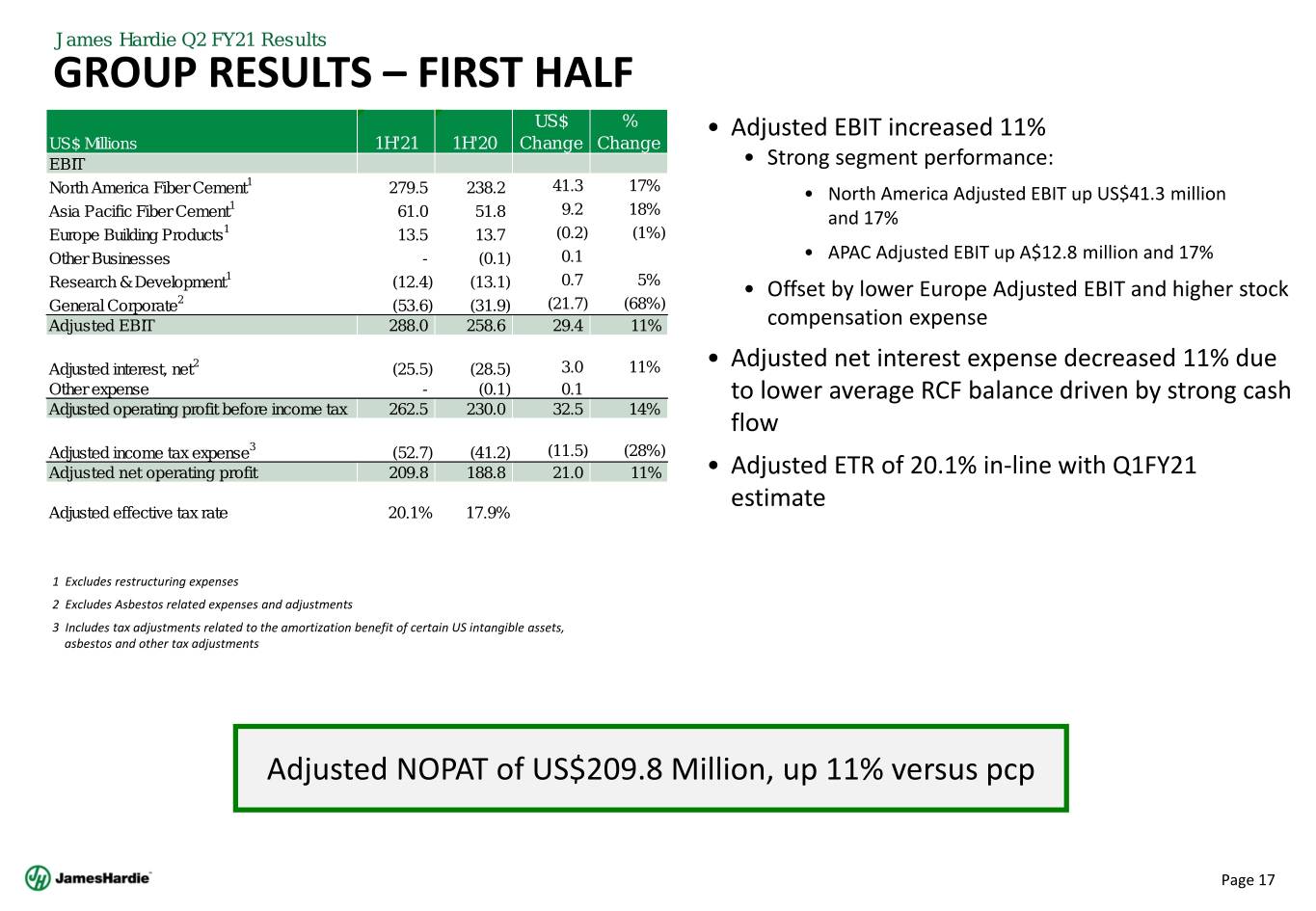James Hardie Q2 FY21 Results GROUP RESULTS – Q2 US$ % • Adjusted EBIT increased 22% US$ Millions Q2'21 Q2'20 Change Change EBIT • Strong segment performance: North America Fiber Cement1 $ 148.6 $ 124.7 23.9 19% • North America Adjusted EBIT up US$23.9 million Asia Pacific Fiber Cement1 38.7 27.0 11.7 43% and 19% Europe Building Products1 11.1 5.8 5.3 91% Other Businesses - (0.5) 0.5 • APAC Adjusted EBIT up A$14.6 million and 37% 1 Research & Development (6.4) (6.9) 0.5 7% • Europe Adjusted EBIT up €4.2 million and 81% General Corporate2 (28.9) (15.9) (13.0) (82%) Adjusted EBIT 163.1 134.2 28.9 22% • Offset by higher stock compensation expense Adjusted interest, net2 (12.8) (14.6) 1.8 12% Other (expense) income (0.2) 0.1 (0.3) • Adjusted net interest expense down 12% Adjusted operating profit before income tax 150.1 119.7 30.4 25% due to no outstanding balance on our Adjusted income tax expense3 (29.6) (21.1) (8.5) (40%) Revolving Credit Facility (“RCF”), driven by Adjusted net operating profit $ 120.5 $ 98.6 21.9 22% strong cash flow Adjusted effective tax rate 19.7% 17.6% • Adjusted net operating profit up 22% to 1 Excludes restructuring expenses US$120.5 million 2 Excludes Asbestos related expenses and adjustments 3 Includes tax adjustments related to the amortization benefit of certain US intangible assets, asbestos and other tax adjustments Adjusted EBIT and Adjusted NOPAT are All Time Quarterly Highs Page 16