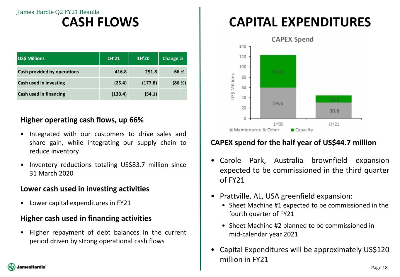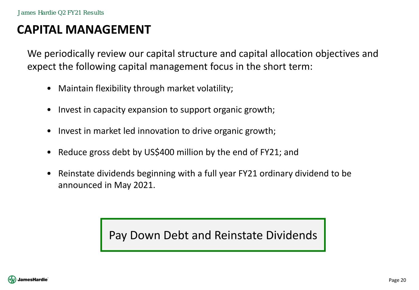 James Hardie Q2 FY21 Results CAPITAL MANAGEMENT We periodically review our capital structure and capital allocation objectives and expect the following capital management focus in the short term: • Maintain flexibility through market volatility; • Invest in capacity expansion to support organic growth; • Invest in market led innovation to drive organic growth; • Reduce gross debt by US$400 million by the end of FY21; and • Reinstate dividends beginning with a full year FY21 ordinary dividend to be announced in May 2021. Pay Down Debt and Reinstate Dividends Page 20