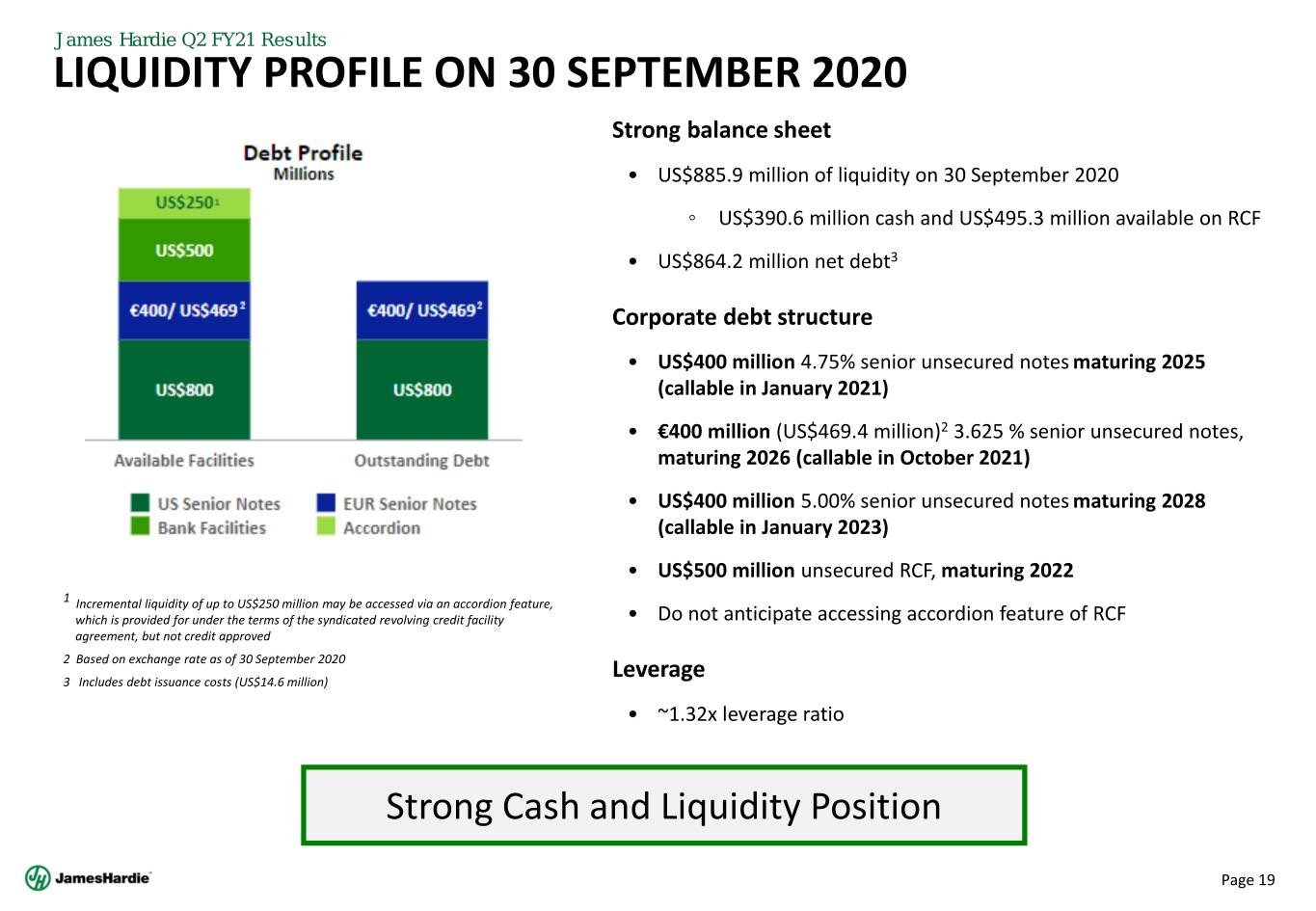 James Hardie Q2 FY21 Results LIQUIDITY PROFILE ON 30 SEPTEMBER 2020 Strong balance sheet • US$885.9 million of liquidity on 30 September 2020 ◦ US$390.6 million cash and US$495.3 million available on RCF • US$864.2 million net debt3 Corporate debt structure 2 • US$400 million 4.75% senior unsecured notes maturing 2025 (callable in January 2021) • €400 million (US$469.4 million)2 3.625 % senior unsecured notes, maturing 2026 (callable in October 2021) • US$400 million 5.00% senior unsecured notes maturing 2028 (callable in January 2023) • US$500 million unsecured RCF, maturing 2022 1 Incremental liquidity of up to US$250 million may be accessed via an accordion feature, which is provided for under the terms of the syndicated revolving credit facility • Do not anticipate accessing accordion feature of RCF agreement, but not credit approved 2 Based on exchange rate as of 30 September 2020 3 Includes debt issuance costs (US$14.6 million) Leverage • ~1.32x leverage ratio Strong Cash and Liquidity Position Page 19