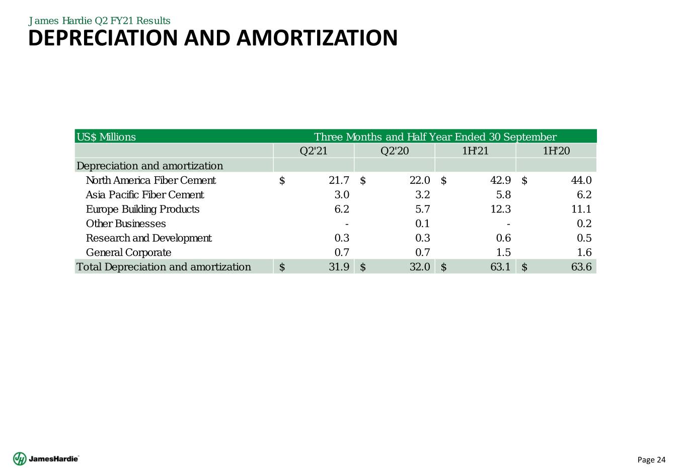 James Hardie Q2 FY21 Results DEPRECIATION AND AMORTIZATION US$ Millions Three Months and Half Year Ended 30 September Q2'21 Q2'20 1H'21 1H'20 Depreciation and amortization North America Fiber Cement $ 21.7 $ 22.0 $ 42.9 $ 44.0 Asia Pacific Fiber Cement 3.0 3.2 5.8 6.2 Europe Building Products 6.2 5.7 12.3 11.1 Other Businesses - 0.1 - 0.2 Research and Development 0.3 0.3 0.6 0.5 General Corporate 0.7 0.7 1.5 1.6 Total Depreciation and amortization $ 31.9 $ 32.0 $ 63.1 $ 63.6 Page 24