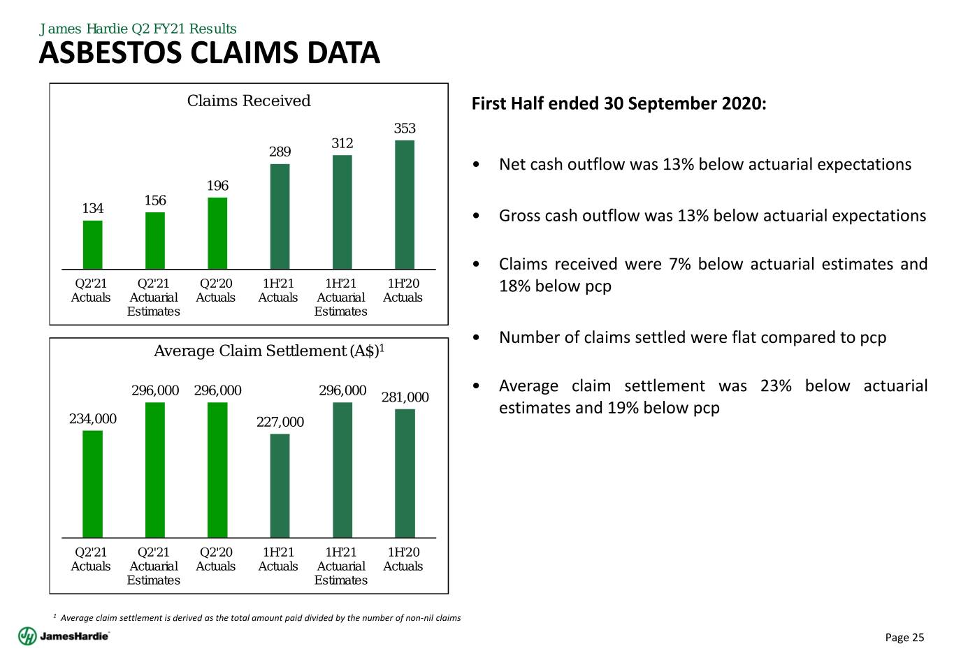 James Hardie Q2 FY21 Results ASBESTOS CLAIMS DATA Claims Received First Half ended 30 September 2020: 353 312 289 • Net cash outflow was 13% below actuarial expectations 196 156 134 • Gross cash outflow was 13% below actuarial expectations • Claims received were 7% below actuarial estimates and Q2'21 Q2'21 Q2'20 1H'21 1H'21 1H'20 18% below pcp Actuals Actuarial Actuals Actuals Actuarial Actuals Estimates Estimates • Number of claims settled were flat compared to pcp Average Claim Settlement (A$)1 296,000 296,000 296,000 • Average claim settlement was 23% below actuarial 281,000 estimates and 19% below pcp 234,000 227,000 Q2'21 Q2'21 Q2'20 1H'21 1H'21 1H'20 Actuals Actuarial Actuals Actuals Actuarial Actuals Estimates Estimates 1 Average claim settlement is derived as the total amount paid divided by the number of non-nil claims Page 25