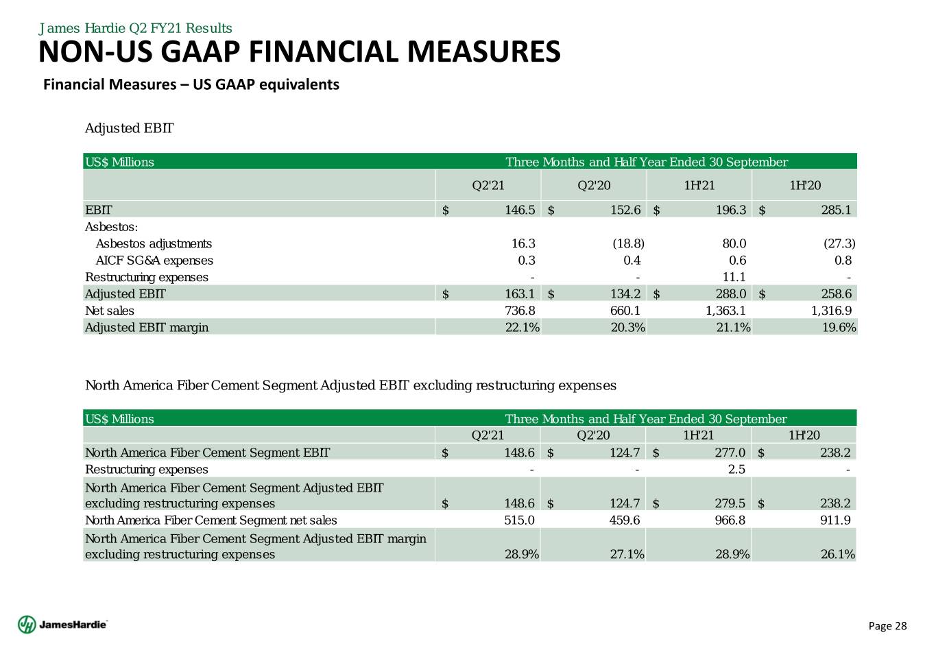 James Hardie Q2 FY21 Results NON-US GAAP FINANCIAL MEASURES Financial Measures – US GAAP equivalents This document contains financial statement line item descriptions that are considered to be non-US GAAP, but are consistent with those used by Australian companies. Because the company prepares its Condensed Consolidated Financial Statements under US GAAP, the following table cross- references each non-US GAAP line item description, as used in Management’s Analysis of Results and Media Release, to the equivalent US GAAP financial statement line item description used in the company’s Condensed Consolidated Financial Statements: Management's Analysis of Results and Consolidated Statements of Operations Media Release and Other Comprehensive Income (Loss) (US GAAP) Net Sales Net Sales Cost of goods sold Cost of goods sold Gross profit Gross profit Selling general and administrative expenses Selling general and administrative expenses Research and development expenses Research and development expenses Asbestos adjustments Asbestos adjustments EBIT* Operating income (loss) Net interest income (expense)* Sum of interest expense and interest income Other income (expense) Other income (expense) Operating profit (loss) before income taxes* Income (loss) before income taxes Income tax (expense) benefit Income tax (expense) benefit Net operating profit (loss)* Net income (loss) *- Represents non-US GAAP descriptions used by Australian companies Page 27