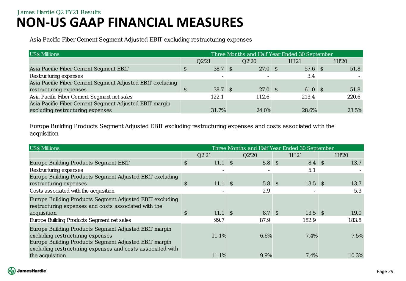 James Hardie Q2 FY21 Results NON-US GAAP FINANCIAL MEASURES Financial Measures – US GAAP equivalents Adjusted EBIT US$ Millions Three Months and Half Year Ended 30 September Q2'21 Q2'20 1H'21 1H'20 EBIT $ 146.5 $ 152.6 $ 196.3 $ 285.1 Asbestos: Asbestos adjustments 16.3 (18.8) 80.0 (27.3) AICF SG&A expenses 0.3 0.4 0.6 0.8 Restructuring expenses - - 11.1 - Adjusted EBIT $ 163.1 $ 134.2 $ 288.0 $ 258.6 Net sales 736.8 660.1 1,363.1 1,316.9 Adjusted EBIT margin 22.1% 20.3% 21.1% 19.6% North America Fiber Cement Segment Adjusted EBIT excluding restructuring expenses US$ Millions Three Months and Half Year Ended 30 September Q2'21 Q2'20 1H'21 1H'20 North America Fiber Cement Segment EBIT $ 148.6 $ 124.7 $ 277.0 $ 238.2 Restructuring expenses - - 2.5 - North America Fiber Cement Segment Adjusted EBIT excluding restructuring expenses $ 148.6 $ 124.7 $ 279.5 $ 238.2 North America Fiber Cement Segment net sales 515.0 459.6 966.8 911.9 North America Fiber Cement Segment Adjusted EBIT margin excluding restructuring expenses 28.9% 27.1% 28.9% 26.1% Page 28