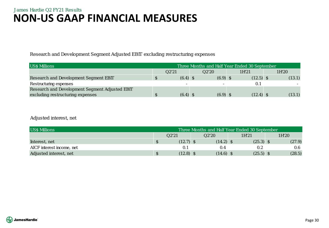 James Hardie Q2 FY21 Results NON-US GAAP FINANCIAL MEASURES Research and Development Segment Adjusted EBIT excluding restructuring expenses US$ Millions Three Months and Half Year Ended 30 September Q2'21 Q2'20 1H'21 1H'20 Research and Development Segment EBIT $ (6.4) $ (6.9) $ (12.5) $ (13.1) Restructuring expenses - - 0.1 - Research and Development Segment Adjusted EBIT excluding restructuring expenses $ (6.4) $ (6.9) $ (12.4) $ (13.1) Adjusted interest, net US$ Millions Three Months and Half Year Ended 30 September Q2'21 Q2'20 1H'21 1H'20 Interest, net $ (12.7) $ (14.2) $ (25.3) $ (27.9) AICF interest income, net 0.1 0.4 0.2 0.6 Adjusted interest, net $ (12.8) $ (14.6) $ (25.5) $ (28.5) Page 30