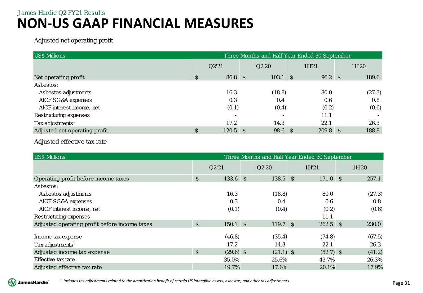 James Hardie Q2 FY21 Results NON-US GAAP FINANCIAL MEASURES Adjusted net operating profit US$ Millions Three Months and Half Year Ended 30 September Q2'21 Q2'20 1H'21 1H'20 Net operating profit $ 86.8 $ 103.1 $ 96.2 $ 189.6 Asbestos: Asbestos adjustments 16.3 (18.8) 80.0 (27.3) AICF SG&A expenses 0.3 0.4 0.6 0.8 AICF interest income, net (0.1) (0.4) (0.2) (0.6) Restructuring expenses - - 11.1 - Tax adjustments1 17.2 14.3 22.1 26.3 Adjusted net operating profit $ 120.5 $ 98.6 $ 209.8 $ 188.8 Adjusted effective tax rate US$ Millions Three Months and Half Year Ended 30 September Q2'21 Q2'20 1H'21 1H'20 Operating profit before income taxes $ 133.6 $ 138.5 $ 171.0 $ 257.1 Asbestos: Asbestos adjustments 16.3 (18.8) 80.0 (27.3) AICF SG&A expenses 0.3 0.4 0.6 0.8 AICF interest income, net (0.1) (0.4) (0.2) (0.6) Restructuring expenses - - 11.1 - Adjusted operating profit before income taxes $ 150.1 $ 119.7 $ 262.5 $ 230.0 Income tax expense (46.8) (35.4) (74.8) (67.5) Tax adjustments1 17.2 14.3 22.1 26.3 Adjusted income tax expense $ (29.6) $ (21.1) $ (52.7) $ (41.2) Effective tax rate 35.0% 25.6% 43.7% 26.3% Adjusted effective tax rate 19.7% 17.6% 20.1% 17.9% 1 Includes tax adjustments related to the amortization benefit of certain US intangible assets, asbestos, and other tax adjustments Page 31