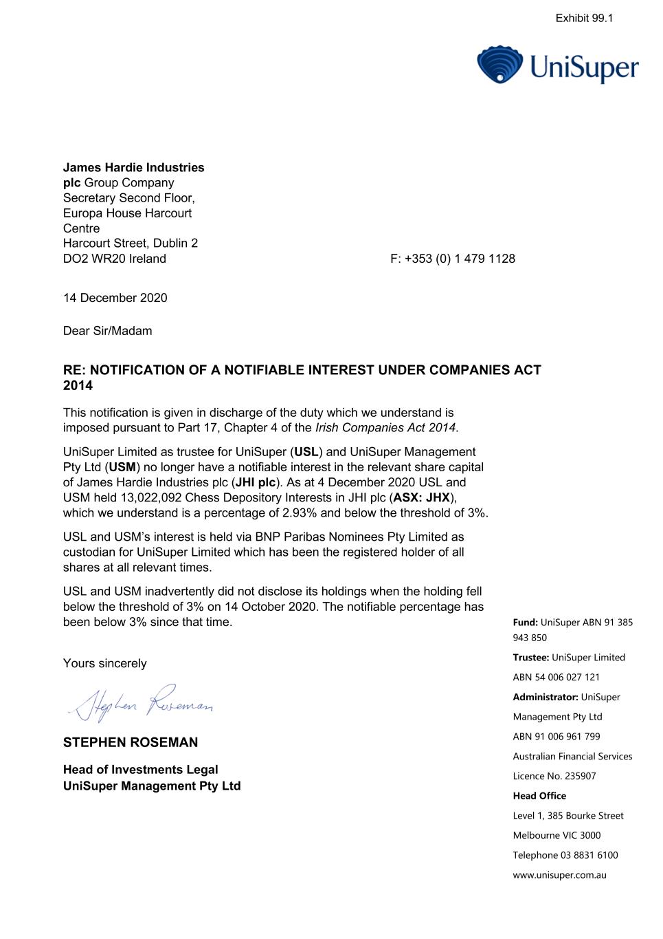 James Hardie Industries plc Group Company Secretary Second Floor, Europa House Harcourt Centre Harcourt Street, Dublin 2 DO2 WR20 Ireland F: +353 (0) 1 479 1128 14 December 2020 Dear Sir/Madam RE: NOTIFICATION OF A NOTIFIABLE INTEREST UNDER COMPANIES ACT 2014 This notification is given in discharge of the duty which we understand is imposed pursuant to Part 17, Chapter 4 of the Irish Companies Act 2014. UniSuper Limited as trustee for UniSuper (USL) and UniSuper Management Pty Ltd (USM) no longer have a notifiable interest in the relevant share capital of James Hardie Industries plc (JHI plc). As at 4 December 2020 USL and USM held 13,022,092 Chess Depository Interests in JHI plc (ASX: JHX), which we understand is a percentage of 2.93% and below the threshold of 3%. USL and USM’s interest is held via BNP Paribas Nominees Pty Limited as custodian for UniSuper Limited which has been the registered holder of all shares at all relevant times. USL and USM inadvertently did not disclose its holdings when the holding fell below the threshold of 3% on 14 October 2020. The notifiable percentage has been below 3% since that time. Yours sincerely STEPHEN ROSEMAN Head of Investments Legal UniSuper Management Pty Ltd Fund: UniSuper ABN 91 385 943 850 Trustee: UniSuper Limited ABN 54 006 027 121 Administrator: UniSuper Management Pty Ltd ABN 91 006 961 799 Australian Financial Services Licence No. 235907 Head Office Level 1, 385 Bourke Street Melbourne VIC 3000 Telephone 03 8831 6100 www.unisuper.com.au Exhibit 99.1