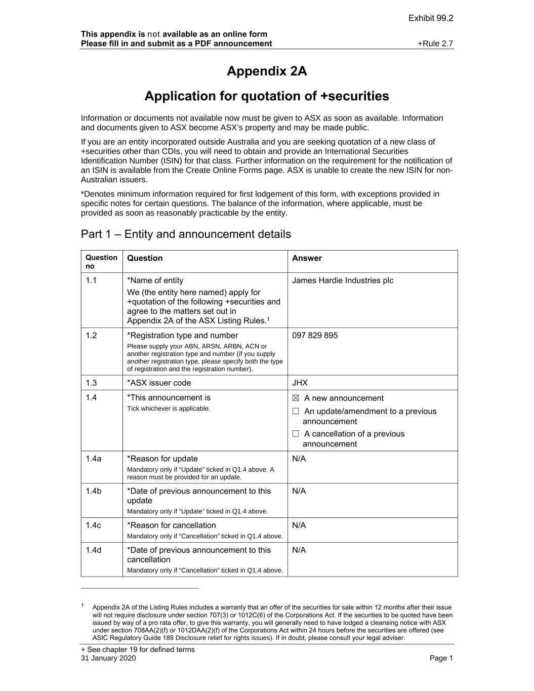 This appendix is not available as an online form Please fill in and submit as a PDF announcement +Rule 2.7 + See chapter 19 for defined terms 31 January 2020 Page 1 Appendix 2A Application for quotation of +securities Information or documents not available now must be given to ASX as soon as available. Information and documents given to ASX become ASX’s property and may be made public. If you are an entity incorporated outside Australia and you are seeking quotation of a new class of +securities other than CDIs, you will need to obtain and provide an International Securities Identification Number (ISIN) for that class. Further information on the requirement for the notification of an ISIN is available from the Create Online Forms page. ASX is unable to create the new ISIN for non- Australian issuers. *Denotes minimum information required for first lodgement of this form, with exceptions provided in specific notes for certain questions. The balance of the information, where applicable, must be provided as soon as reasonably practicable by the entity. Part 1 – Entity and announcement details Question no Question Answer 1.1 *Name of entity We (the entity here named) apply for +quotation of the following +securities and agree to the matters set out in Appendix 2A of the ASX Listing Rules.1 James Hardie Industries plc 1.2 *Registration type and number Please supply your ABN, ARSN, ARBN, ACN or another registration type and number (if you supply another registration type, please specify both the type of registration and the registration number). 097 829 895 1.3 *ASX issuer code JHX 1.4 *This announcement is Tick whichever is applicable. ☒ A new announcement ☐ An update/amendment to a previous announcement ☐ A cancellation of a previous announcement 1.4a *Reason for update Mandatory only if “Update” ticked in Q1.4 above. A reason must be provided for an update. N/A 1.4b *Date of previous announcement to this update Mandatory only if “Update” ticked in Q1.4 above. N/A 1.4c *Reason for cancellation Mandatory only if “Cancellation” ticked in Q1.4 above. N/A 1.4d *Date of previous announcement to this cancellation Mandatory only if “Cancellation” ticked in Q1.4 above. N/A 1 Appendix 2A of the Listing Rules includes a warranty that an offer of the securities for sale within 12 months after their issue will not require disclosure under section 707(3) or 1012C(6) of the Corporations Act. If the securities to be quoted have been issued by way of a pro rata offer, to give this warranty, you will generally need to have lodged a cleansing notice with ASX under section 708AA(2)(f) or 1012DAA(2)(f) of the Corporations Act within 24 hours before the securities are offered (see ASIC Regulatory Guide 189 Disclosure relief for rights issues). If in doubt, please consult your legal adviser. Exhibit 99.2