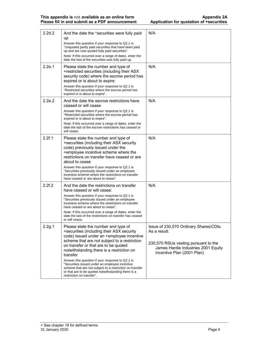 This appendix is not available as an online form Appendix 2A Please fill in and submit as a PDF announcement Application for quotation of +securities + See chapter 19 for defined terms 31 January 2020 Page 4 2.2d.2 And the date the +securities were fully paid up Answer this question if your response to Q2.1 is “Unquoted partly paid securities that have been paid up and are now quoted fully paid securities”. Note: If this occurred over a range of dates, enter the date the last of the securities was fully paid up. N/A 2.2e.1 Please state the number and type of +restricted securities (including their ASX security code) where the escrow period has expired or is about to expire Answer this question if your response to Q2.1 is “Restricted securities where the escrow period has expired or is about to expire”. N/A 2.2e.2 And the date the escrow restrictions have ceased or will cease Answer this question if your response to Q2.1 is “Restricted securities where the escrow period has expired or is about to expire”. Note: If this occurred over a range of dates, enter the date the last of the escrow restrictions has ceased or will cease. N/A 2.2f.1 Please state the number and type of +securities (including their ASX security code) previously issued under the +employee incentive scheme where the restrictions on transfer have ceased or are about to cease Answer this question if your response to Q2.1 is “Securities previously issued under an employee incentive scheme where the restrictions on transfer have ceased or are about to cease”. N/A 2.2f.2 And the date the restrictions on transfer have ceased or will cease: Answer this question if your response to Q2.1 is “Securities previously issued under an employee incentive scheme where the restrictions on transfer have ceased or are about to cease”. Note: If this occurred over a range of dates, enter the date the last of the restrictions on transfer has ceased or will cease. N/A 2.2g.1 Please state the number and type of +securities (including their ASX security code) issued under an +employee incentive scheme that are not subject to a restriction on transfer or that are to be quoted notwithstanding there is a restriction on transfer Answer this question if your response to Q2.1 is “Securities issued under an employee incentive scheme that are not subject to a restriction on transfer or that are to be quoted notwithstanding there is a restriction on transfer”. Issue of 230,570 Ordinary Shares/CDIs. As a result: 230,570 RSUs vesting pursuant to the James Hardie Industries 2001 Equity Incentive Plan (2001 Plan)