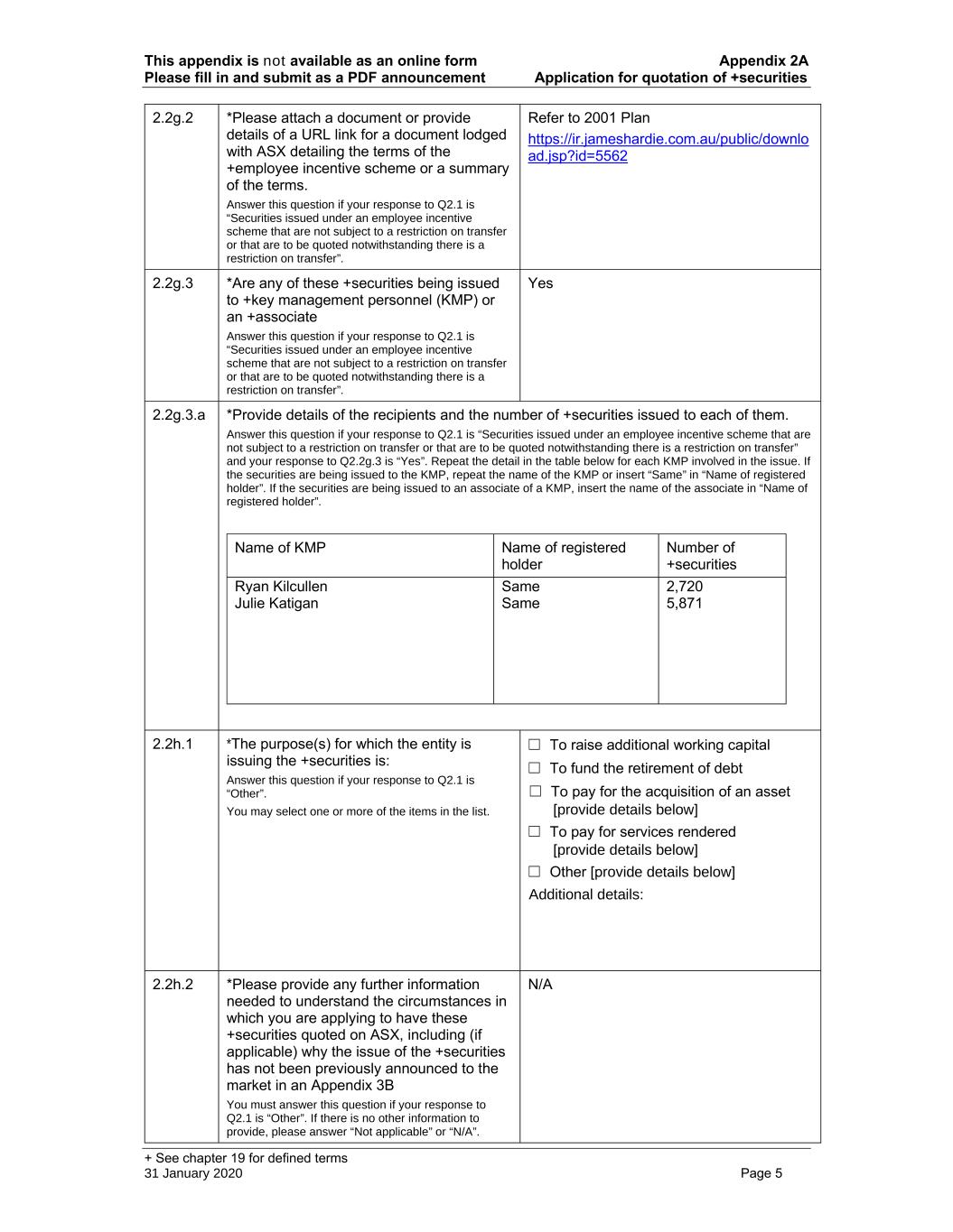 This appendix is not available as an online form Appendix 2A Please fill in and submit as a PDF announcement Application for quotation of +securities + See chapter 19 for defined terms 31 January 2020 Page 5 2.2g.2 *Please attach a document or provide details of a URL link for a document lodged with ASX detailing the terms of the +employee incentive scheme or a summary of the terms. Answer this question if your response to Q2.1 is “Securities issued under an employee incentive scheme that are not subject to a restriction on transfer or that are to be quoted notwithstanding there is a restriction on transfer”. Refer to 2001 Plan https://ir.jameshardie.com.au/public/downlo ad.jsp?id=5562 2.2g.3 *Are any of these +securities being issued to +key management personnel (KMP) or an +associate Answer this question if your response to Q2.1 is “Securities issued under an employee incentive scheme that are not subject to a restriction on transfer or that are to be quoted notwithstanding there is a restriction on transfer”. Yes 2.2g.3.a *Provide details of the recipients and the number of +securities issued to each of them. Answer this question if your response to Q2.1 is “Securities issued under an employee incentive scheme that are not subject to a restriction on transfer or that are to be quoted notwithstanding there is a restriction on transfer” and your response to Q2.2g.3 is “Yes”. Repeat the detail in the table below for each KMP involved in the issue. If the securities are being issued to the KMP, repeat the name of the KMP or insert “Same” in “Name of registered holder”. If the securities are being issued to an associate of a KMP, insert the name of the associate in “Name of registered holder”. Name of KMP Name of registered holder Number of +securities Ryan Kilcullen Julie Katigan Same Same 2,720 5,871 2.2h.1 *The purpose(s) for which the entity is issuing the +securities is: Answer this question if your response to Q2.1 is “Other”. You may select one or more of the items in the list. ☐ To raise additional working capital ☐ To fund the retirement of debt ☐ To pay for the acquisition of an asset [provide details below] ☐ To pay for services rendered [provide details below] ☐ Other [provide details below] Additional details: 2.2h.2 *Please provide any further information needed to understand the circumstances in which you are applying to have these +securities quoted on ASX, including (if applicable) why the issue of the +securities has not been previously announced to the market in an Appendix 3B You must answer this question if your response to Q2.1 is “Other”. If there is no other information to provide, please answer “Not applicable” or “N/A”. N/A