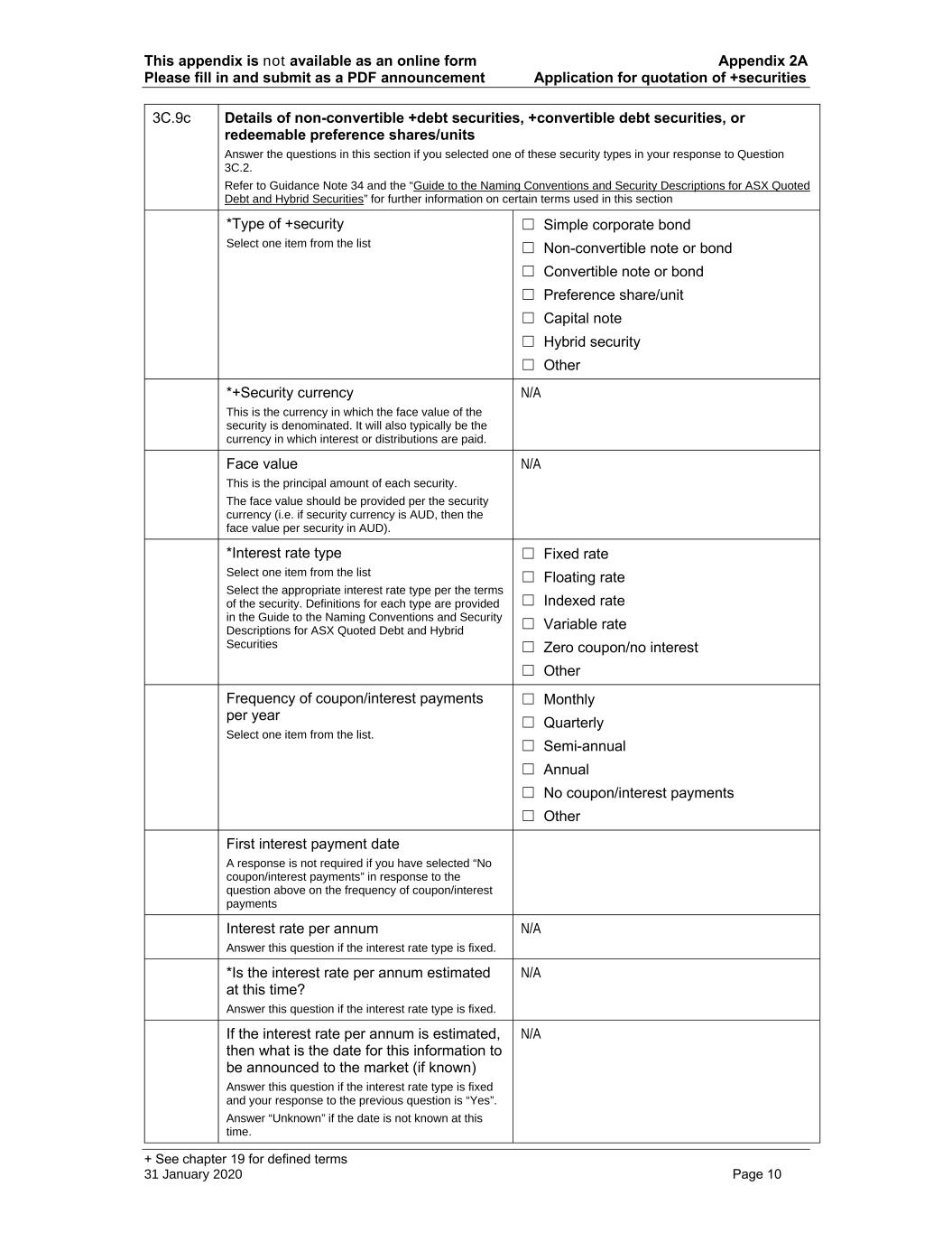 This appendix is not available as an online form Appendix 2A Please fill in and submit as a PDF announcement Application for quotation of +securities + See chapter 19 for defined terms 31 January 2020 Page 10 3C.9c Details of non-convertible +debt securities, +convertible debt securities, or redeemable preference shares/units Answer the questions in this section if you selected one of these security types in your response to Question 3C.2. Refer to Guidance Note 34 and the “Guide to the Naming Conventions and Security Descriptions for ASX Quoted Debt and Hybrid Securities” for further information on certain terms used in this section *Type of +security Select one item from the list ☐ Simple corporate bond ☐ Non-convertible note or bond ☐ Convertible note or bond ☐ Preference share/unit ☐ Capital note ☐ Hybrid security ☐ Other *+Security currency This is the currency in which the face value of the security is denominated. It will also typically be the currency in which interest or distributions are paid. N/A Face value This is the principal amount of each security. The face value should be provided per the security currency (i.e. if security currency is AUD, then the face value per security in AUD). N/A *Interest rate type Select one item from the list Select the appropriate interest rate type per the terms of the security. Definitions for each type are provided in the Guide to the Naming Conventions and Security Descriptions for ASX Quoted Debt and Hybrid Securities ☐ Fixed rate ☐ Floating rate ☐ Indexed rate ☐ Variable rate ☐ Zero coupon/no interest ☐ Other Frequency of coupon/interest payments per year Select one item from the list. ☐ Monthly ☐ Quarterly ☐ Semi-annual ☐ Annual ☐ No coupon/interest payments ☐ Other First interest payment date A response is not required if you have selected “No coupon/interest payments” in response to the question above on the frequency of coupon/interest payments Interest rate per annum Answer this question if the interest rate type is fixed. N/A *Is the interest rate per annum estimated at this time? Answer this question if the interest rate type is fixed. N/A If the interest rate per annum is estimated, then what is the date for this information to be announced to the market (if known) Answer this question if the interest rate type is fixed and your response to the previous question is “Yes”. Answer “Unknown” if the date is not known at this time. N/A