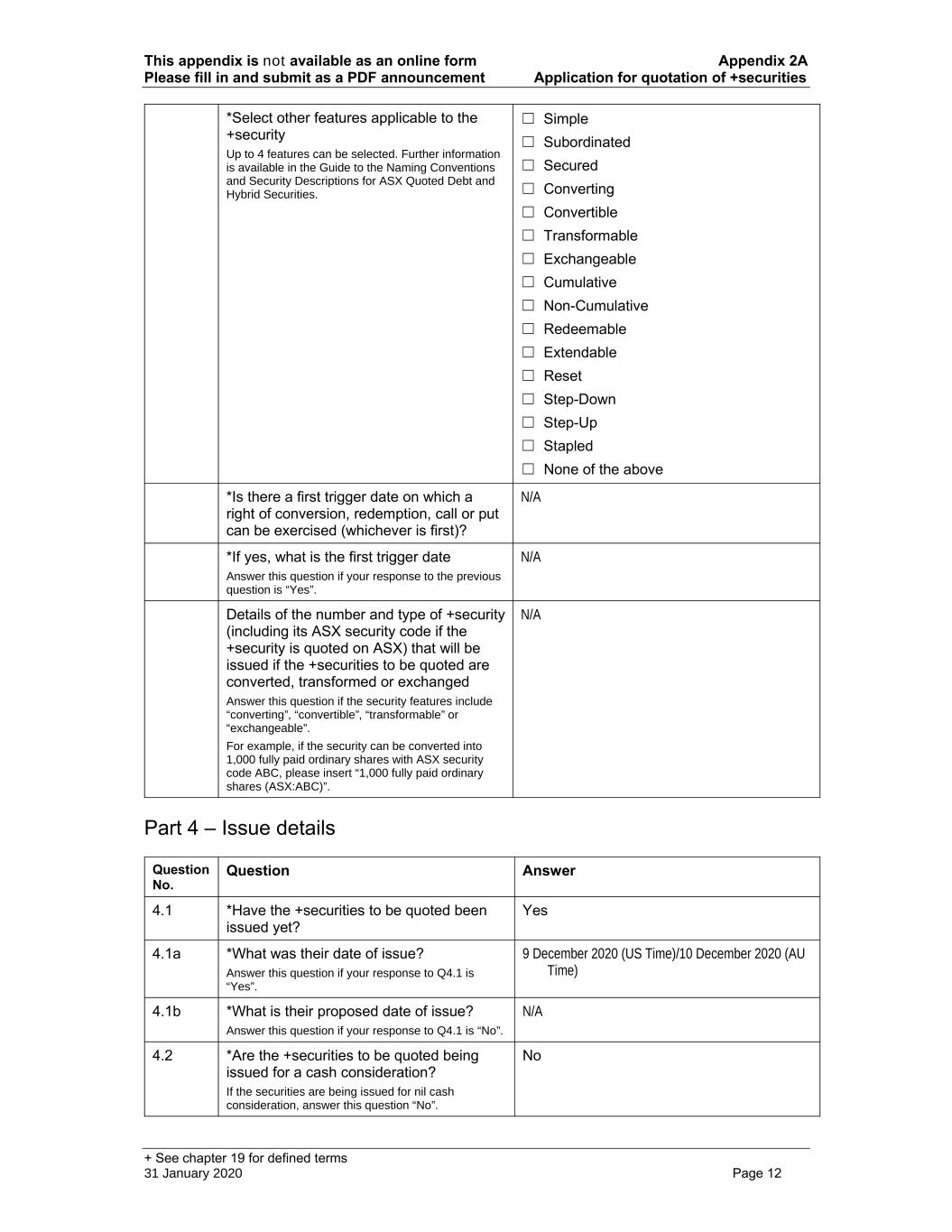 This appendix is not available as an online form Appendix 2A Please fill in and submit as a PDF announcement Application for quotation of +securities + See chapter 19 for defined terms 31 January 2020 Page 12 *Select other features applicable to the +security Up to 4 features can be selected. Further information is available in the Guide to the Naming Conventions and Security Descriptions for ASX Quoted Debt and Hybrid Securities. ☐ Simple ☐ Subordinated ☐ Secured ☐ Converting ☐ Convertible ☐ Transformable ☐ Exchangeable ☐ Cumulative ☐ Non-Cumulative ☐ Redeemable ☐ Extendable ☐ Reset ☐ Step-Down ☐ Step-Up ☐ Stapled ☐ None of the above *Is there a first trigger date on which a right of conversion, redemption, call or put can be exercised (whichever is first)? N/A *If yes, what is the first trigger date Answer this question if your response to the previous question is “Yes”. N/A Details of the number and type of +security (including its ASX security code if the +security is quoted on ASX) that will be issued if the +securities to be quoted are converted, transformed or exchanged Answer this question if the security features include “converting”, “convertible”, “transformable” or “exchangeable”. For example, if the security can be converted into 1,000 fully paid ordinary shares with ASX security code ABC, please insert “1,000 fully paid ordinary shares (ASX:ABC)”. N/A Part 4 – Issue details Question No. Question Answer 4.1 *Have the +securities to be quoted been issued yet? Yes 4.1a *What was their date of issue? Answer this question if your response to Q4.1 is “Yes”. 9 December 2020 (US Time)/10 December 2020 (AU Time) 4.1b *What is their proposed date of issue? Answer this question if your response to Q4.1 is “No”. N/A 4.2 *Are the +securities to be quoted being issued for a cash consideration? If the securities are being issued for nil cash consideration, answer this question “No”. No