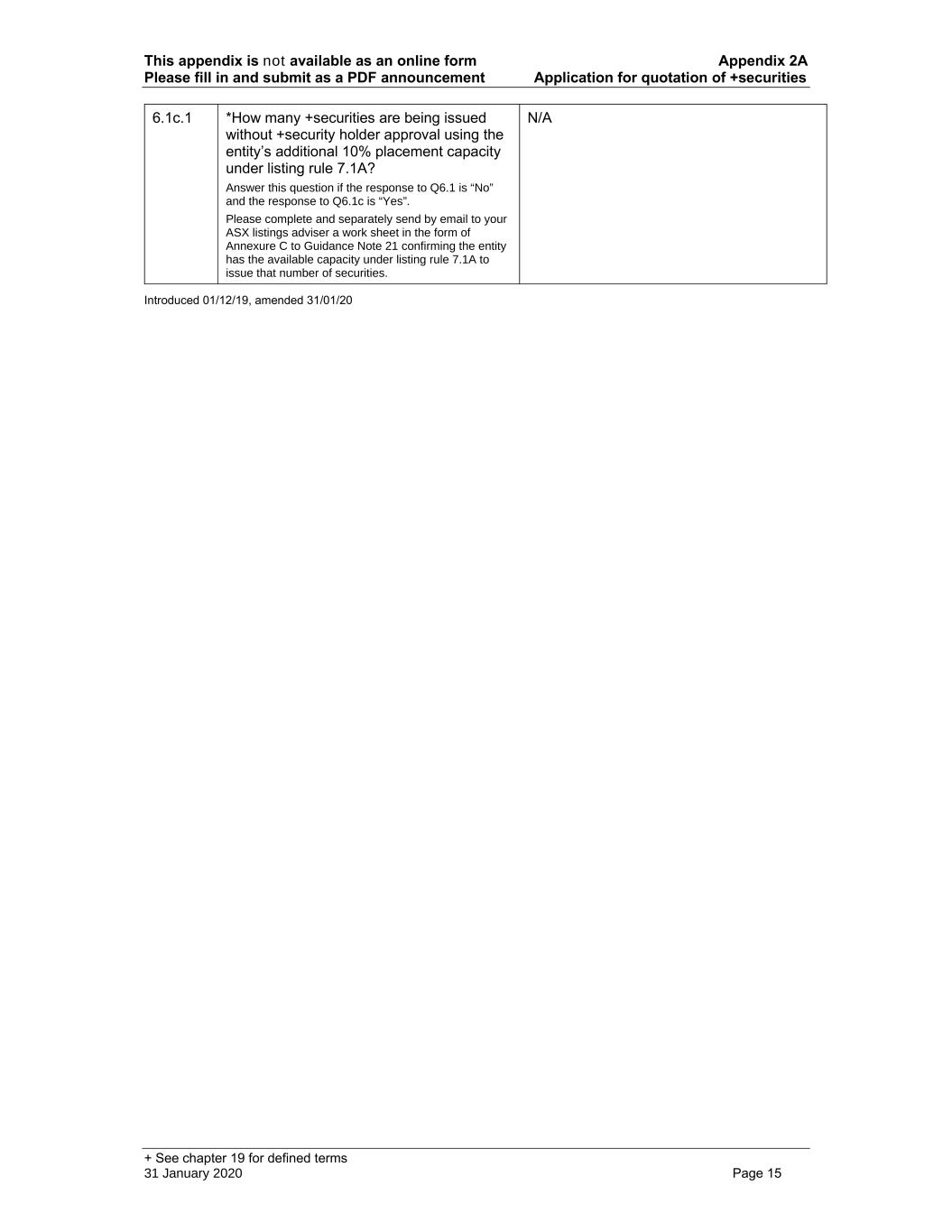 This appendix is not available as an online form Appendix 2A Please fill in and submit as a PDF announcement Application for quotation of +securities + See chapter 19 for defined terms 31 January 2020 Page 15 6.1c.1 *How many +securities are being issued without +security holder approval using the entity’s additional 10% placement capacity under listing rule 7.1A? Answer this question if the response to Q6.1 is “No” and the response to Q6.1c is “Yes”. Please complete and separately send by email to your ASX listings adviser a work sheet in the form of Annexure C to Guidance Note 21 confirming the entity has the available capacity under listing rule 7.1A to issue that number of securities. N/A Introduced 01/12/19, amended 31/01/20