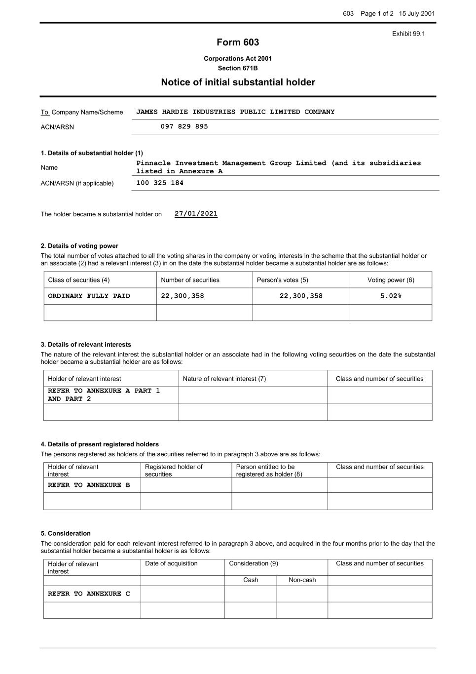 603 Page 1 of 2 15 July 2001 Form 603 Corporations Act 2001 Section 671B Notice of initial substantial holder To Company Name/Scheme JAMES HARDIE INDUSTRIES PUBLIC LIMITED COMPANY ACN/ARSN 097 829 895 1. Details of substantial holder (1) Name Pinnacle Investment Management Group Limited (and its subsidiaries listed in Annexure A ACN/ARSN (if applicable) 100 325 184 The holder became a substantial holder on 27/01/2021 2. Details of voting power The total number of votes attached to all the voting shares in the company or voting interests in the scheme that the substantial holder or an associate (2) had a relevant interest (3) in on the date the substantial holder became a substantial holder are as follows: Class of securities (4) Number of securities Person's votes (5) Voting power (6) ORDINARY FULLY PAID 22,300,358 22,300,358 5.02% 3. Details of relevant interests The nature of the relevant interest the substantial holder or an associate had in the following voting securities on the date the substantial holder became a substantial holder are as follows: Holder of relevant interest Nature of relevant interest (7) Class and number of securities REFER TO ANNEXURE A PART 1 AND PART 2 4. Details of present registered holders The persons registered as holders of the securities referred to in paragraph 3 above are as follows: Holder of relevant interest Registered holder of securities Person entitled to be registered as holder (8) Class and number of securities REFER TO ANNEXURE B 5. Consideration The consideration paid for each relevant interest referred to in paragraph 3 above, and acquired in the four months prior to the day that the substantial holder became a substantial holder is as follows: Holder of relevant interest Date of acquisition Consideration (9) Class and number of securities Cash Non-cash REFER TO ANNEXURE C Exhibit 99.1