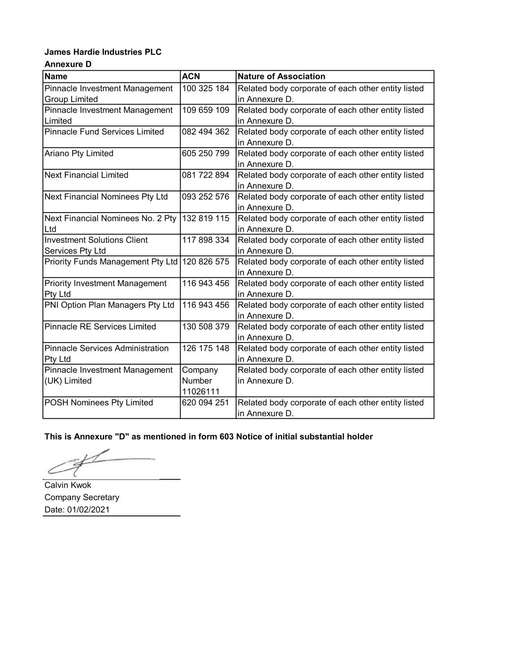 James Hardie Industries PLC Annexure D Name ACN Nature of Association Pinnacle Investment Management Group Limited 100 325 184 Related body corporate of each other entity listed in Annexure D. Pinnacle Investment Management Limited 109 659 109 Related body corporate of each other entity listed in Annexure D. Pinnacle Fund Services Limited 082 494 362 Related body corporate of each other entity listed in Annexure D. Ariano Pty Limited 605 250 799 Related body corporate of each other entity listed in Annexure D. Next Financial Limited 081 722 894 Related body corporate of each other entity listed in Annexure D. Next Financial Nominees Pty Ltd 093 252 576 Related body corporate of each other entity listed in Annexure D. Next Financial Nominees No. 2 Pty Ltd 132 819 115 Related body corporate of each other entity listed in Annexure D. Investment Solutions Client Services Pty Ltd 117 898 334 Related body corporate of each other entity listed in Annexure D. Priority Funds Management Pty Ltd 120 826 575 Related body corporate of each other entity listed in Annexure D. Priority Investment Management Pty Ltd 116 943 456 Related body corporate of each other entity listed in Annexure D. PNI Option Plan Managers Pty Ltd 116 943 456 Related body corporate of each other entity listed in Annexure D. Pinnacle RE Services Limited 130 508 379 Related body corporate of each other entity listed in Annexure D. Pinnacle Services Administration Pty Ltd 126 175 148 Related body corporate of each other entity listed in Annexure D. Pinnacle Investment Management (UK) Limited Company Number 11026111 Related body corporate of each other entity listed in Annexure D. POSH Nominees Pty Limited 620 094 251 Related body corporate of each other entity listed in Annexure D. This is Annexure "D" as mentioned in form 603 Notice of initial substantial holder Calvin Kwok Company Secretary Date: 01/02/2021