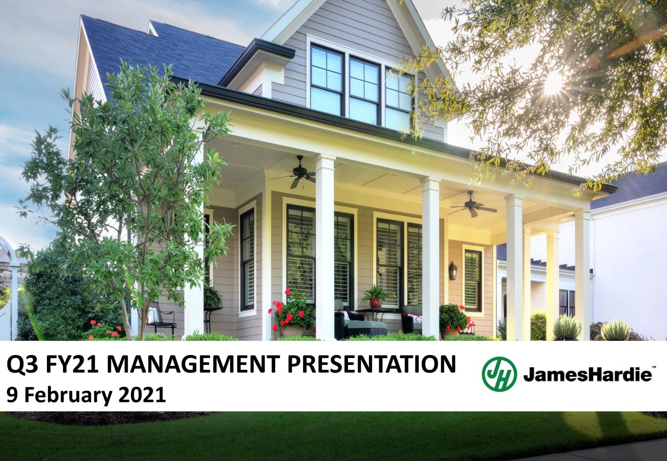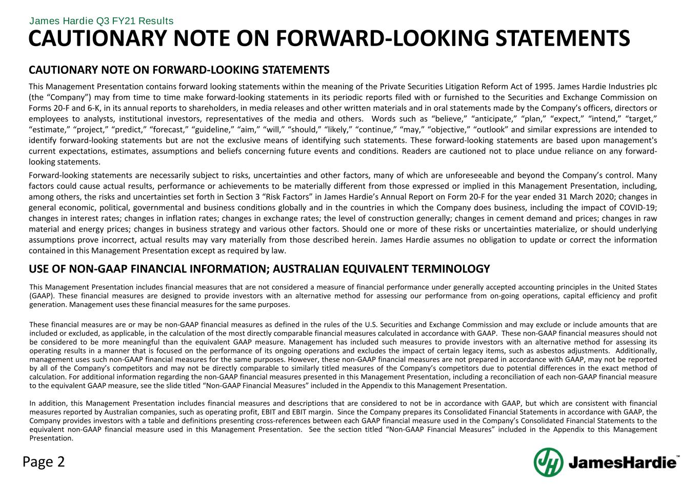 Page 2 James Hardie Q3 FY21 Results CAUTIONARY NOTE ON FORWARD-LOOKING STATEMENTS This Management Presentation contains forward looking statements within the meaning of the Private Securities Litigation Reform Act of 1995. James Hardie Industries plc (the “Company”) may from time to time make forward-looking statements in its periodic reports filed with or furnished to the Securities and Exchange Commission on Forms 20-F and 6-K, in its annual reports to shareholders, in media releases and other written materials and in oral statements made by the Company’s officers, directors or employees to analysts, institutional investors, representatives of the media and others. Words such as “believe,” “anticipate,” “plan,” “expect,” “intend,” “target,” “estimate,” “project,” “predict,” “forecast,” “guideline,” “aim,” “will,” “should,” “likely,” “continue,” “may,” “objective,” “outlook” and similar expressions are intended to identify forward-looking statements but are not the exclusive means of identifying such statements. These forward-looking statements are based upon management's current expectations, estimates, assumptions and beliefs concerning future events and conditions. Readers are cautioned not to place undue reliance on any forward- looking statements. Forward-looking statements are necessarily subject to risks, uncertainties and other factors, many of which are unforeseeable and beyond the Company’s control. Many factors could cause actual results, performance or achievements to be materially different from those expressed or implied in this Management Presentation, including, among others, the risks and uncertainties set forth in Section 3 “Risk Factors” in James Hardie’s Annual Report on Form 20-F for the year ended 31 March 2020; changes in general economic, political, governmental and business conditions globally and in the countries in which the Company does business, including the impact of COVID-19; changes in interest rates; changes in inflation rates; changes in exchange rates; the level of construction generally; changes in cement demand and prices; changes in raw material and energy prices; changes in business strategy and various other factors. Should one or more of these risks or uncertainties materialize, or should underlying assumptions prove incorrect, actual results may vary materially from those described herein. James Hardie assumes no obligation to update or correct the information contained in this Management Presentation except as required by law. This Management Presentation includes financial measures that are not considered a measure of financial performance under generally accepted accounting principles in the United States (GAAP). These financial measures are designed to provide investors with an alternative method for assessing our performance from on-going operations, capital efficiency and profit generation. Management uses these financial measures for the same purposes. These financial measures are or may be non-GAAP financial measures as defined in the rules of the U.S. Securities and Exchange Commission and may exclude or include amounts that are included or excluded, as applicable, in the calculation of the most directly comparable financial measures calculated in accordance with GAAP. These non-GAAP financial measures should not be considered to be more meaningful than the equivalent GAAP measure. Management has included such measures to provide investors with an alternative method for assessing its operating results in a manner that is focused on the performance of its ongoing operations and excludes the impact of certain legacy items, such as asbestos adjustments. Additionally, management uses such non-GAAP financial measures for the same purposes. However, these non-GAAP financial measures are not prepared in accordance with GAAP, may not be reported by all of the Company’s competitors and may not be directly comparable to similarly titled measures of the Company’s competitors due to potential differences in the exact method of calculation. For additional information regarding the non-GAAP financial measures presented in this Management Presentation, including a reconciliation of each non-GAAP financial measure to the equivalent GAAP measure, see the slide titled “Non-GAAP Financial Measures” included in the Appendix to this Management Presentation. In addition, this Management Presentation includes financial measures and descriptions that are considered to not be in accordance with GAAP, but which are consistent with financial measures reported by Australian companies, such as operating profit, EBIT and EBIT margin. Since the Company prepares its Consolidated Financial Statements in accordance with GAAP, the Company provides investors with a table and definitions presenting cross-references between each GAAP financial measure used in the Company’s Consolidated Financial Statements to the equivalent non-GAAP financial measure used in this Management Presentation. See the section titled “Non-GAAP Financial Measures” included in the Appendix to this Management Presentation. CAUTIONARY NOTE ON FORWARD-LOOKING STATEMENTS USE OF NON-GAAP FINANCIAL INFORMATION; AUSTRALIAN EQUIVALENT TERMINOLOGY