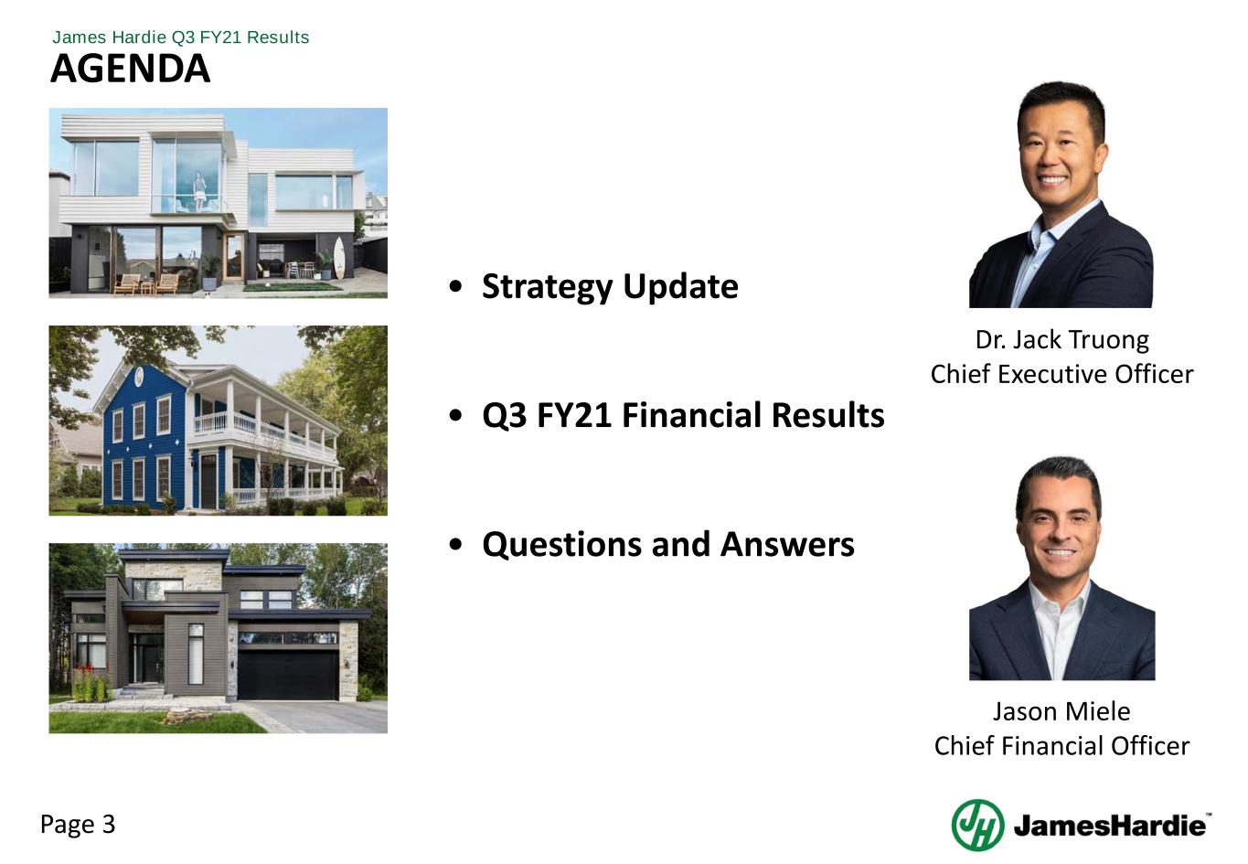 Page 3 James Hardie Q3 FY21 Results AGENDA • Strategy Update • Q3 FY21 Financial Results • Questions and Answers Dr. Jack Truong Chief Executive Officer Jason Miele Chief Financial Officer