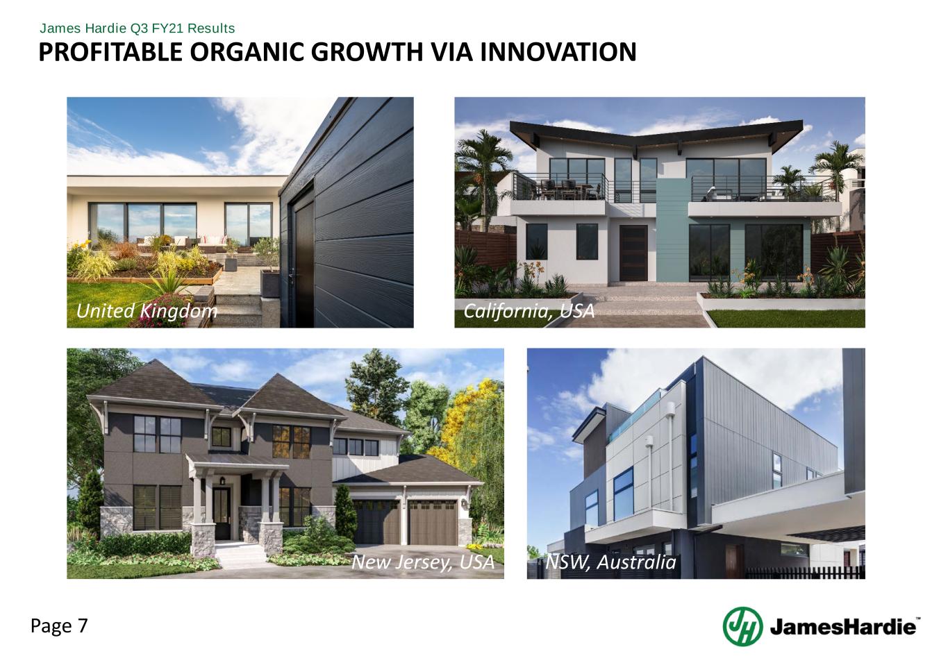 Page 7 James Hardie Q3 FY21 Results PROFITABLE ORGANIC GROWTH VIA INNOVATION New Jersey, USA United Kingdom NSW, Australia California, USA