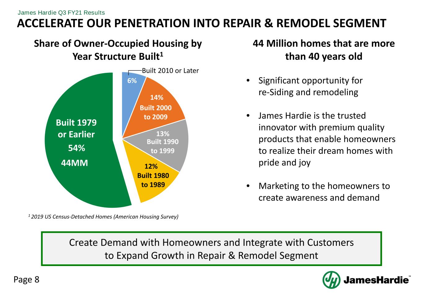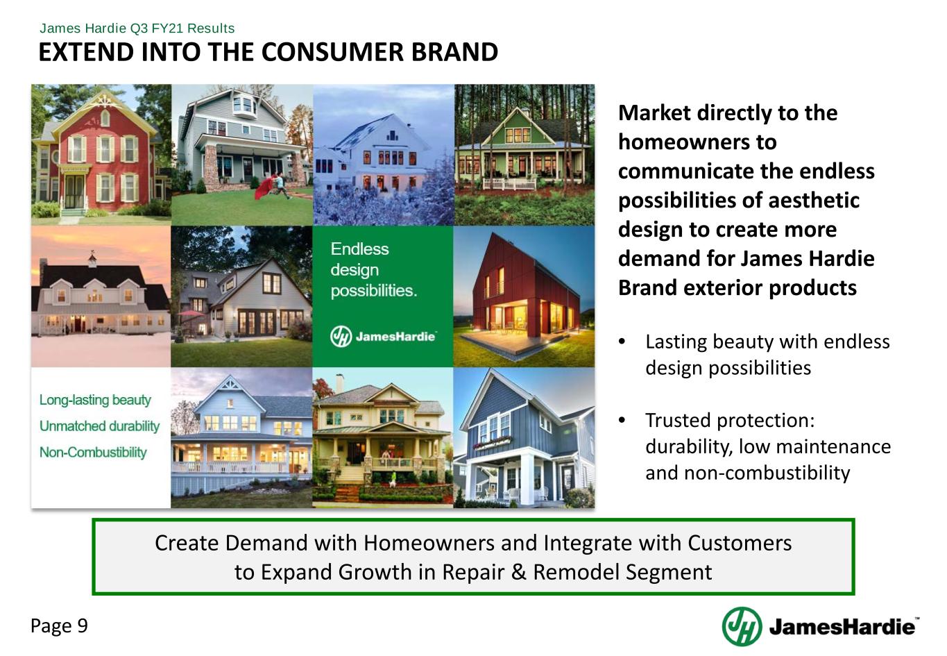 Page 8 James Hardie Q3 FY21 Results ACCELERATE OUR PENETRATION INTO REPAIR & REMODEL SEGMENT Create Demand with Homeowners and Integrate with Customers to Expand Growth in Repair & Remodel Segment 44 Million homes that are more than 40 years old • Significant opportunity for re-Siding and remodeling • James Hardie is the trusted innovator with premium quality products that enable homeowners to realize their dream homes with pride and joy • Marketing to the homeowners to create awareness and demand 6% 14% 13% 12% 54% Built 1979 or Earlier Built 2000 to 2009 Built 1990 to 1999 Built 1980 to 1989 1 2019 US Census-Detached Homes (American Housing Survey) Built 2010 or Later Share of Owner-Occupied Housing by Year Structure Built1 44MM