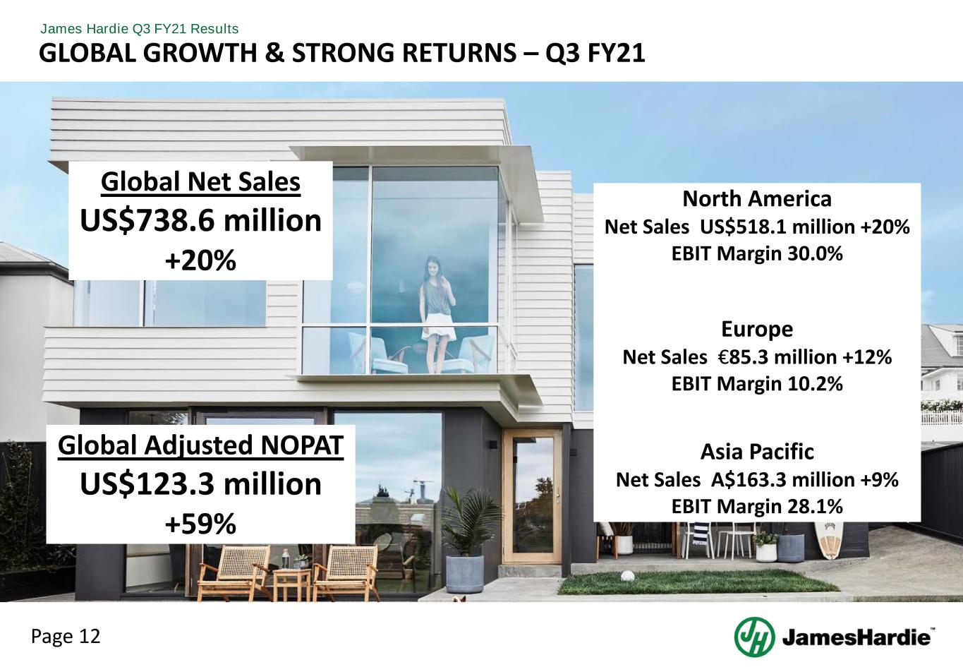 Page 11 James Hardie Q3 FY21 Results GLOBAL CAPACITY EXPANSION AND NEW PRODUCTS CAPABILITY FY21 Prattville 1 Tacoma ColorPlus Prattville HLD Trim FY22 FY23 FY24 NA SM Capacity NA Finishing Capacity APAC SM Capacity R&D Pilot Plants R&D Pilot Plants Fontana, CA Rosehill, Aus Carole Park Prattville 2 Peru ColorPlus Summerville Massachusetts ColorPlus • +800 mmstf nameplate capacity in NA • +60 mmstf nameplate capacity in ANZ • Additional ColorPlus capability in NA • Additional HLD Trim capability in NA • Enable innovation with R&D pilot plants in US and Australia NA Trim Capacity