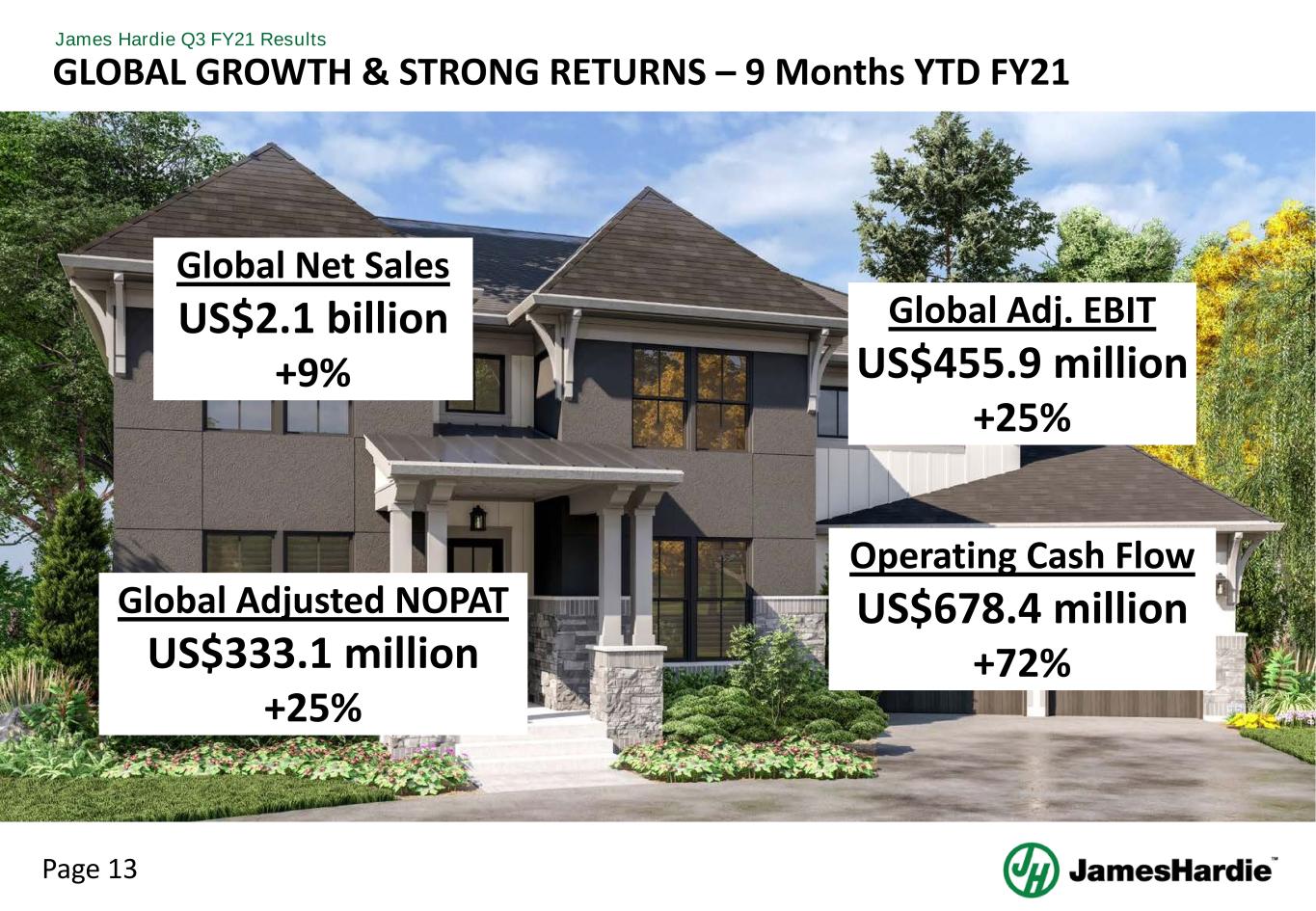 Page 13 James Hardie Q3 FY21 Results GLOBAL GROWTH & STRONG RETURNS – 9 Months YTD FY21 Global Net Sales US$2.1 billion +9% Global Adj. EBIT US$455.9 million +25% Operating Cash Flow US$678.4 million +72% Global Adjusted NOPAT US$333.1 million +25%