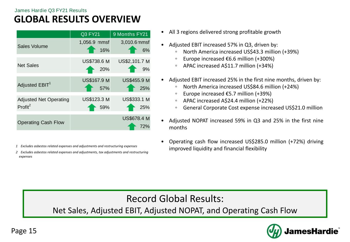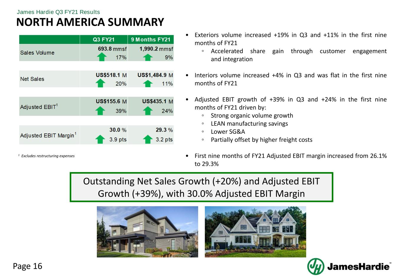 Page 15 James Hardie Q3 FY21 Results • All 3 regions delivered strong profitable growth • Adjusted EBIT increased 57% in Q3, driven by: ◦ North America increased US$43.3 million (+39%) ◦ Europe increased €6.6 million (+300%) ◦ APAC increased A$11.7 million (+34%) • Adjusted EBIT increased 25% in the first nine months, driven by: ◦ North America increased US$84.6 million (+24%) ◦ Europe increased €5.7 million (+39%) ◦ APAC increased A$24.4 million (+22%) ◦ General Corporate Cost expense increased US$21.0 million • Adjusted NOPAT increased 59% in Q3 and 25% in the first nine months • Operating cash flow increased US$285.0 million (+72%) driving improved liquidity and financial flexibility GLOBAL RESULTS OVERVIEW Record Global Results: Net Sales, Adjusted EBIT, Adjusted NOPAT, and Operating Cash Flow 1 Excludes asbestos related expenses and adjustments and restructuring expenses 2 Excludes asbestos related expenses and adjustments, tax adjustments and restructuring expenses M M M M M M M Operating Cash Flow Adjusted Net Operating Profit2 Adjusted EBIT1 Sales Volume Net Sales 20% 57% US$123.3 59% Q3 FY21 1,056.9 mmsf 16% US$738.6 US$167.9 9 Months FY21 3,010.6mmsf 6% US$2,101.7 9% US$455.9 25% US$333.1 25% US$678.4 72%