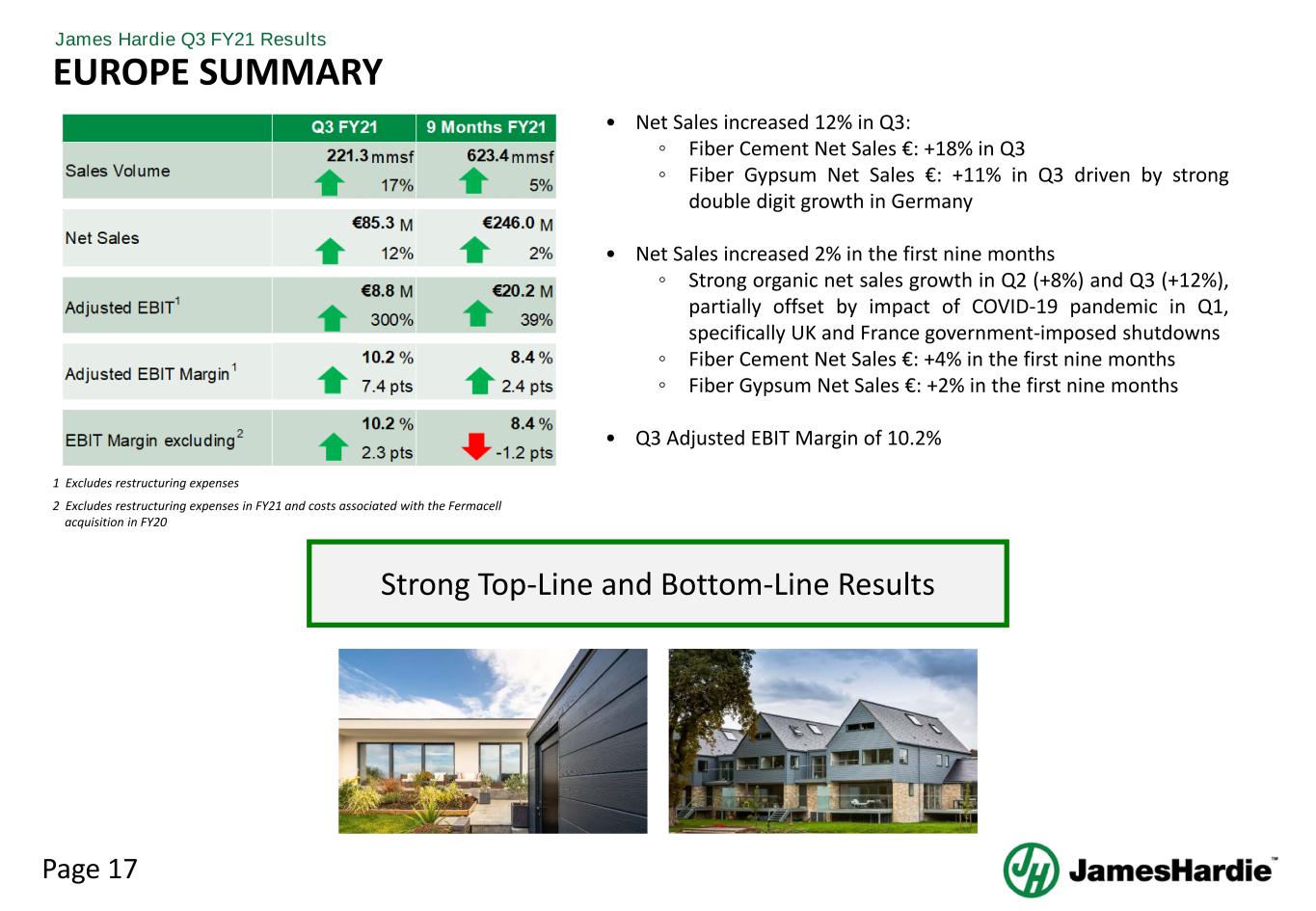 Page 16 James Hardie Q3 FY21 Results NORTH AMERICA SUMMARY Outstanding Net Sales Growth (+20%) and Adjusted EBIT Growth (+39%), with 30.0% Adjusted EBIT Margin 1 Excludes restructuring expenses • Exteriors volume increased +19% in Q3 and +11% in the first nine months of FY21 ◦ Accelerated share gain through customer engagement and integration • Interiors volume increased +4% in Q3 and was flat in the first nine months of FY21 • Adjusted EBIT growth of +39% in Q3 and +24% in the first nine months of FY21 driven by: ◦ Strong organic volume growth ◦ LEAN manufacturing savings ◦ Lower SG&A ◦ Partially offset by higher freight costs • First nine months of FY21 Adjusted EBIT margin increased from 26.1% to 29.3%