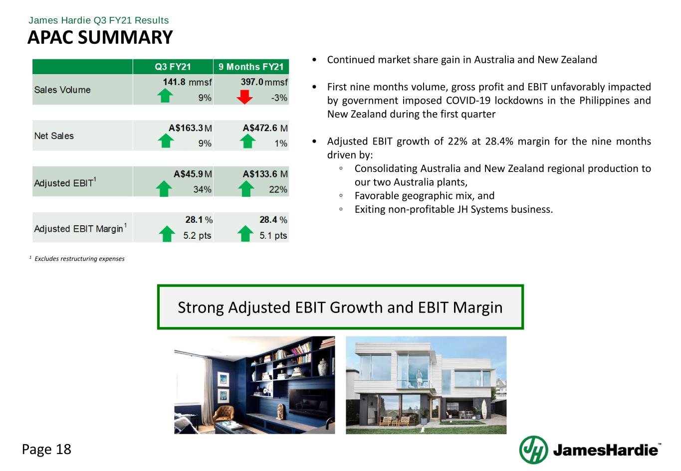 Page 18 James Hardie Q3 FY21 Results APAC SUMMARY • Continued market share gain in Australia and New Zealand • First nine months volume, gross profit and EBIT unfavorably impacted by government imposed COVID-19 lockdowns in the Philippines and New Zealand during the first quarter • Adjusted EBIT growth of 22% at 28.4% margin for the nine months driven by: ◦ Consolidating Australia and New Zealand regional production to our two Australia plants, ◦ Favorable geographic mix, and ◦ Exiting non-profitable JH Systems business. Strong Adjusted EBIT Growth and EBIT Margin 1 Excludes restructuring expenses