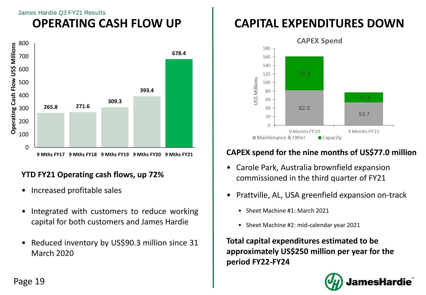 Page 19 James Hardie Q3 FY21 Results 1 OPERATING CASH FLOW UP CAPITAL EXPENDITURES DOWN CAPEX spend for the nine months of US$77.0 million • Carole Park, Australia brownfield expansion commissioned in the third quarter of FY21 • Prattville, AL, USA greenfield expansion on-track • Sheet Machine #1: March 2021 • Sheet Machine #2: mid-calendar year 2021 Total capital expenditures estimated to be approximately US$250 million per year for the period FY22-FY24 YTD FY21 Operating cash flows, up 72% • Increased profitable sales • Integrated with customers to reduce working capital for both customers and James Hardie • Reduced inventory by US$90.3 million since 31 March 2020 265.8 271.6 309.3 393.4 678.4 0 100 200 300 400 500 600 700 800 9 Mths FY17 9 Mths FY18 9 Mths FY19 9 Mths FY20 9 Mths FY21 O pe ra ti ng C as h Fl ow U S$ M ill io ns