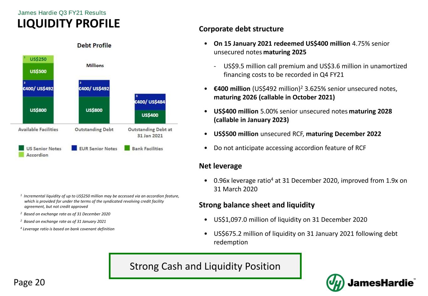 Page 20 James Hardie Q3 FY21 Results LIQUIDITY PROFILE Corporate debt structure • On 15 January 2021 redeemed US$400 million 4.75% senior unsecured notes maturing 2025 - US$9.5 million call premium and US$3.6 million in unamortized financing costs to be recorded in Q4 FY21 • €400 million (US$492 million)2 3.625% senior unsecured notes, maturing 2026 (callable in October 2021) • US$400 million 5.00% senior unsecured notes maturing 2028 (callable in January 2023) • US$500 million unsecured RCF, maturing December 2022 • Do not anticipate accessing accordion feature of RCF Net leverage • 0.96x leverage ratio4 at 31 December 2020, improved from 1.9x on 31 March 2020 Strong balance sheet and liquidity • US$1,097.0 million of liquidity on 31 December 2020 • US$675.2 million of liquidity on 31 January 2021 following debt redemption Strong Cash and Liquidity Position 2 1 Incremental liquidity of up to US$250 million may be accessed via an accordion feature, which is provided for under the terms of the syndicated revolving credit facility agreement, but not credit approved 2 Based on exchange rate as of 31 December 2020 2 Based on exchange rate as of 31 January 2021 4 Leverage ratio is based on bank covenant definition