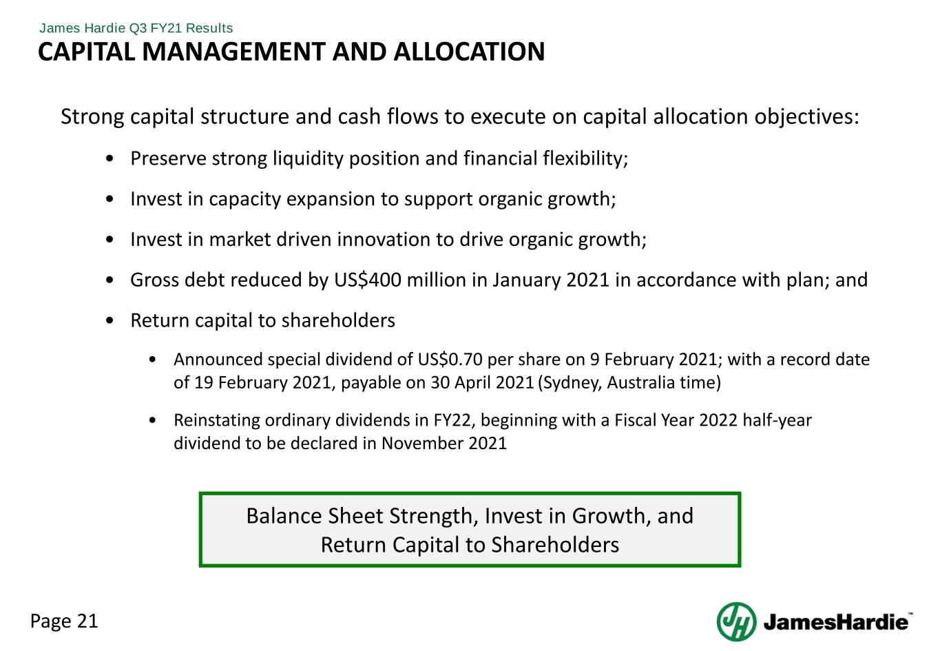 Page 21 James Hardie Q3 FY21 Results Strong capital structure and cash flows to execute on capital allocation objectives: • Preserve strong liquidity position and financial flexibility; • Invest in capacity expansion to support organic growth; • Invest in market driven innovation to drive organic growth; • Gross debt reduced by US$400 million in January 2021 in accordance with plan; and • Return capital to shareholders • Announced special dividend of US$0.70 per share on 9 February 2021; with a record date of 19 February 2021, payable on 30 April 2021 (Sydney, Australia time) • Reinstating ordinary dividends in FY22, beginning with a Fiscal Year 2022 half-year dividend to be declared in November 2021 Balance Sheet Strength, Invest in Growth, and Return Capital to Shareholders CAPITAL MANAGEMENT AND ALLOCATION
