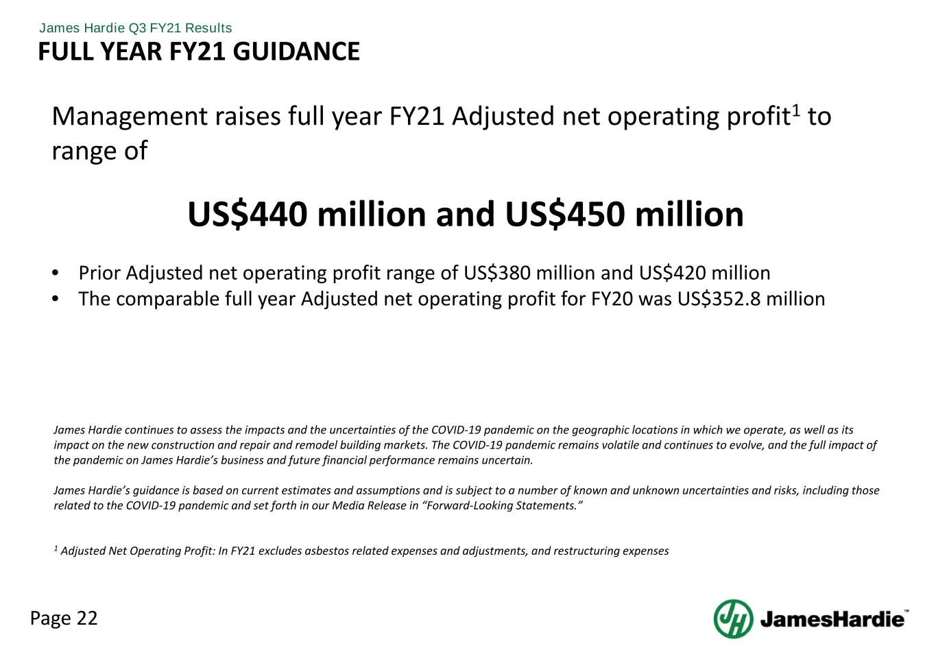Page 22 James Hardie Q3 FY21 Results FULL YEAR FY21 GUIDANCE Management raises full year FY21 Adjusted net operating profit1 to range of US$440 million and US$450 million • Prior Adjusted net operating profit range of US$380 million and US$420 million • The comparable full year Adjusted net operating profit for FY20 was US$352.8 million James Hardie continues to assess the impacts and the uncertainties of the COVID-19 pandemic on the geographic locations in which we operate, as well as its impact on the new construction and repair and remodel building markets. The COVID-19 pandemic remains volatile and continues to evolve, and the full impact of the pandemic on James Hardie’s business and future financial performance remains uncertain. James Hardie’s guidance is based on current estimates and assumptions and is subject to a number of known and unknown uncertainties and risks, including those related to the COVID-19 pandemic and set forth in our Media Release in “Forward-Looking Statements.” 1 Adjusted Net Operating Profit: In FY21 excludes asbestos related expenses and adjustments, and restructuring expenses