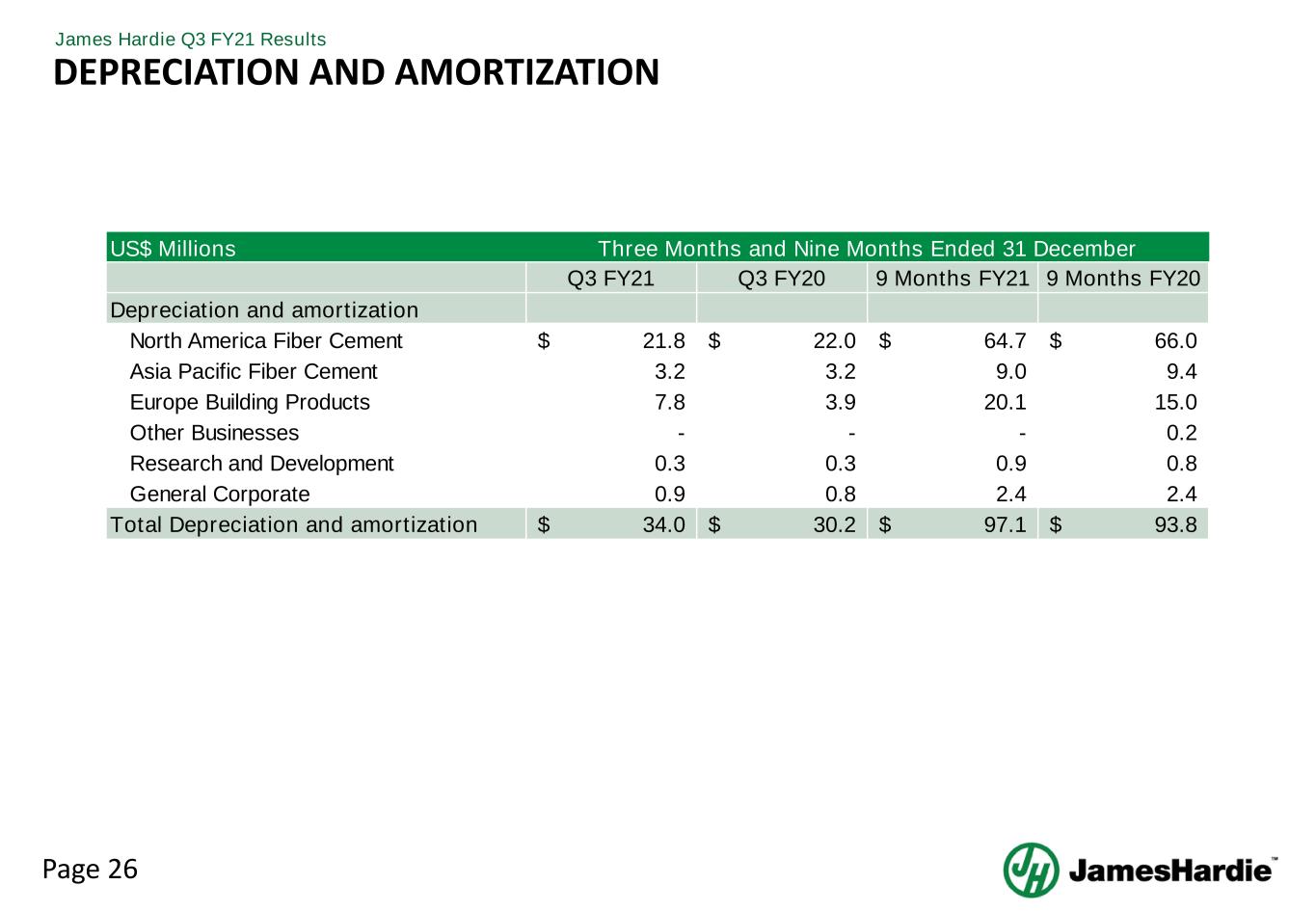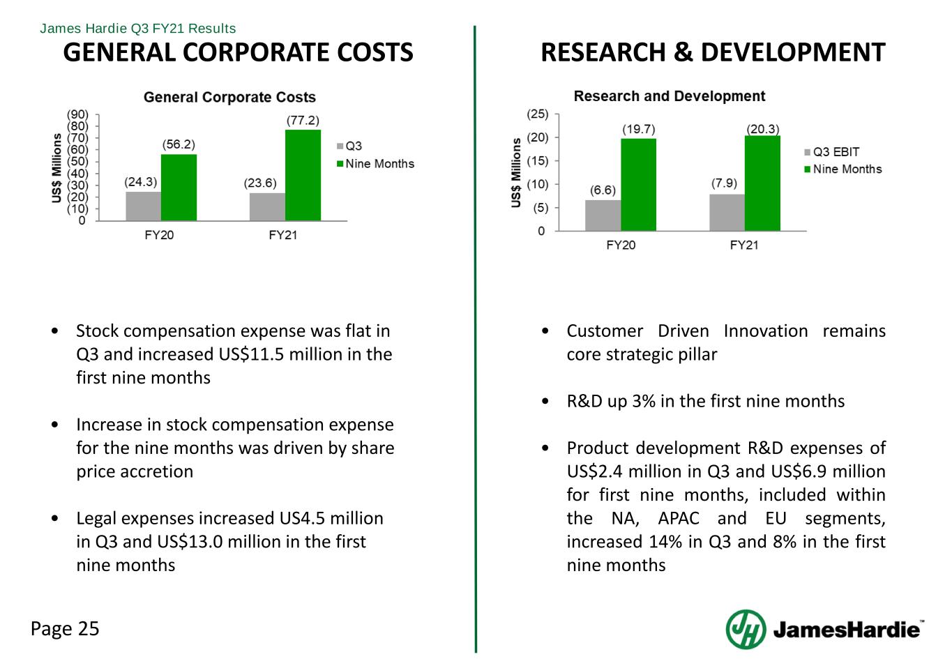 Page 25 James Hardie Q3 FY21 Results GENERAL CORPORATE COSTS • Stock compensation expense was flat in Q3 and increased US$11.5 million in the first nine months • Increase in stock compensation expense for the nine months was driven by share price accretion • Legal expenses increased US4.5 million in Q3 and US$13.0 million in the first nine months • Customer Driven Innovation remains core strategic pillar • R&D up 3% in the first nine months • Product development R&D expenses of US$2.4 million in Q3 and US$6.9 million for first nine months, included within the NA, APAC and EU segments, increased 14% in Q3 and 8% in the first nine months RESEARCH & DEVELOPMENT