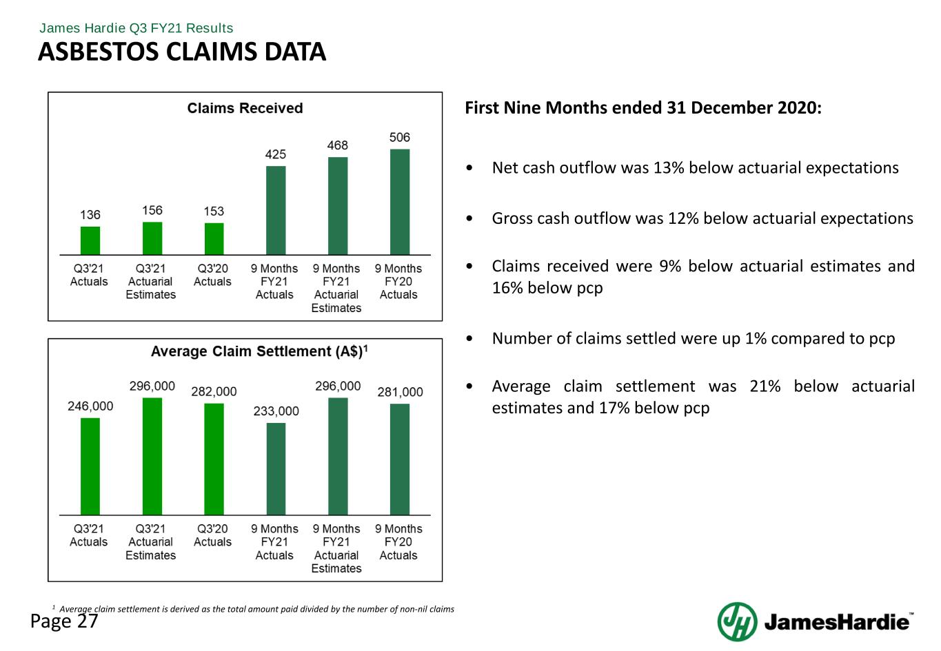 Page 27 James Hardie Q3 FY21 Results First Nine Months ended 31 December 2020: • Net cash outflow was 13% below actuarial expectations • Gross cash outflow was 12% below actuarial expectations • Claims received were 9% below actuarial estimates and 16% below pcp • Number of claims settled were up 1% compared to pcp • Average claim settlement was 21% below actuarial estimates and 17% below pcp ASBESTOS CLAIMS DATA 1 Average claim settlement is derived as the total amount paid divided by the number of non-nil claims