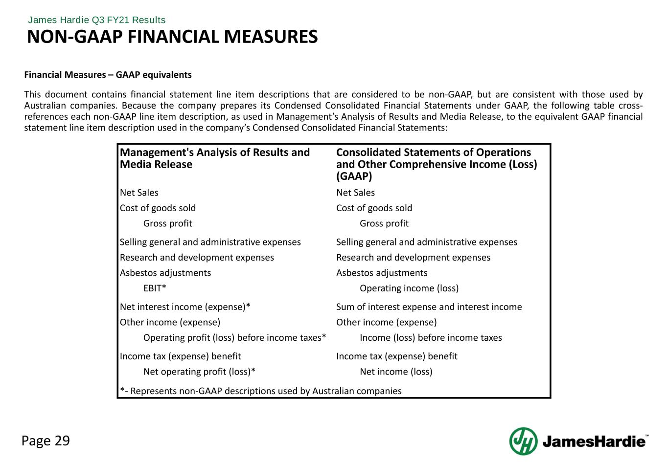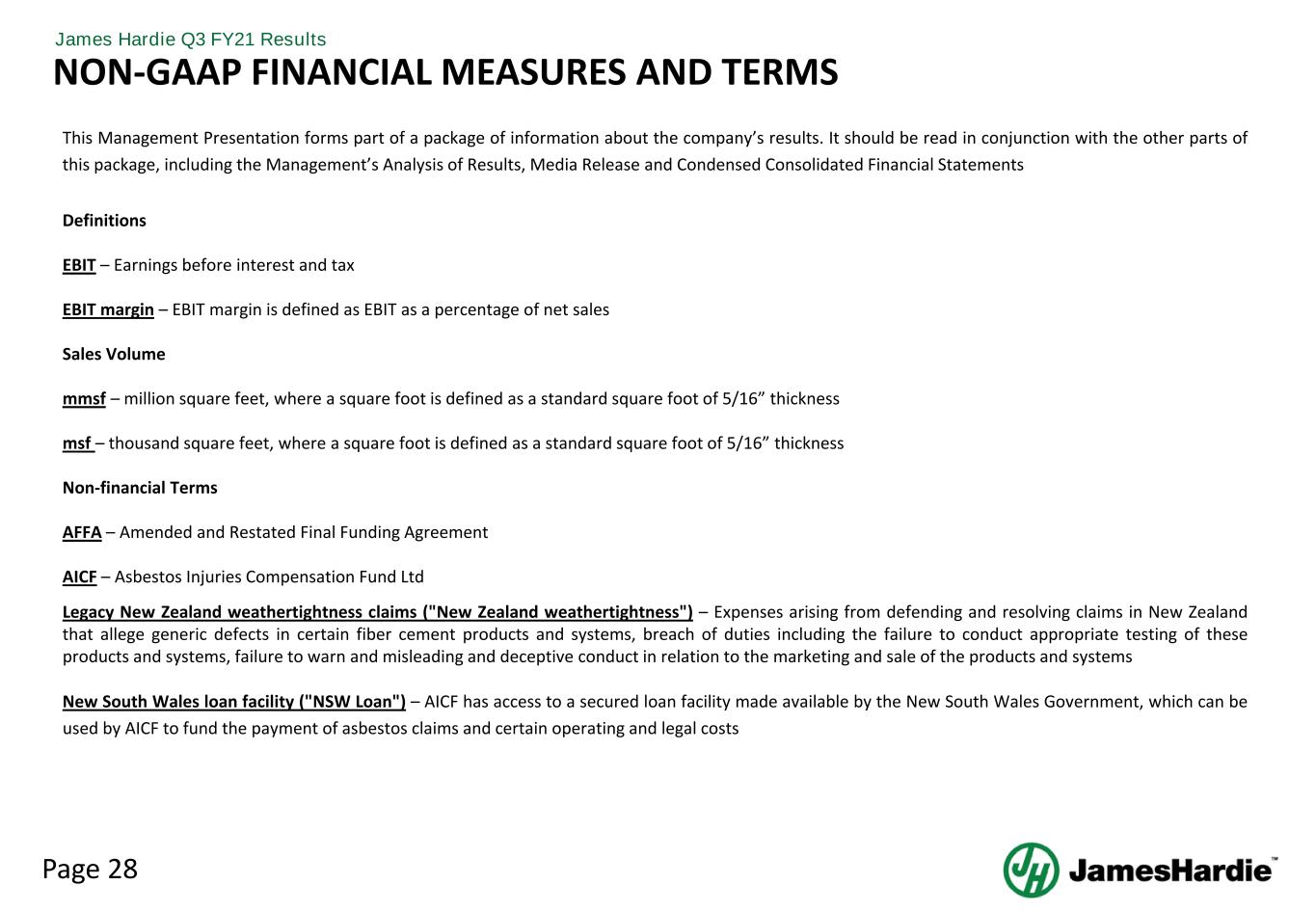 Page 28 James Hardie Q3 FY21 Results NON-GAAP FINANCIAL MEASURES AND TERMS This Management Presentation forms part of a package of information about the company’s results. It should be read in conjunction with the other parts of this package, including the Management’s Analysis of Results, Media Release and Condensed Consolidated Financial Statements Definitions EBIT – Earnings before interest and tax EBIT margin – EBIT margin is defined as EBIT as a percentage of net sales Sales Volume mmsf – million square feet, where a square foot is defined as a standard square foot of 5/16” thickness msf – thousand square feet, where a square foot is defined as a standard square foot of 5/16” thickness Non-financial Terms AFFA – Amended and Restated Final Funding Agreement AICF – Asbestos Injuries Compensation Fund Ltd Legacy New Zealand weathertightness claims ("New Zealand weathertightness") – Expenses arising from defending and resolving claims in New Zealand that allege generic defects in certain fiber cement products and systems, breach of duties including the failure to conduct appropriate testing of these products and systems, failure to warn and misleading and deceptive conduct in relation to the marketing and sale of the products and systems New South Wales loan facility ("NSW Loan") – AICF has access to a secured loan facility made available by the New South Wales Government, which can be used by AICF to fund the payment of asbestos claims and certain operating and legal costs