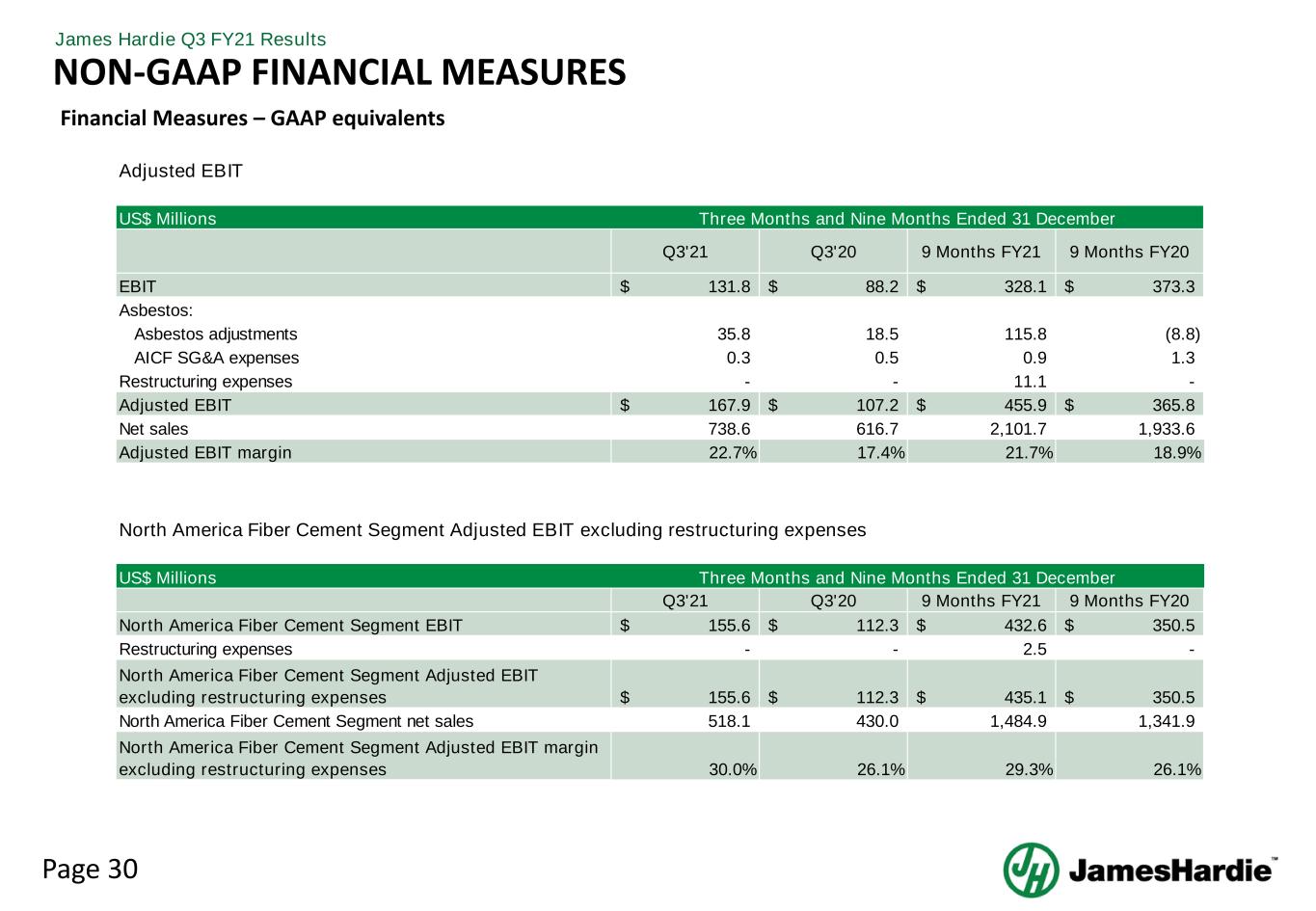 Page 30 James Hardie Q3 FY21 Results Financial Measures – GAAP equivalents NON-GAAP FINANCIAL MEASURES Adjusted EBIT US$ Millions Q3'21 Q3'20 9 Months FY21 9 Months FY20 EBIT 131.8$ 88.2$ 328.1$ 373.3$ Asbestos: Asbestos adjustments 35.8 18.5 115.8 (8.8) AICF SG&A expenses 0.3 0.5 0.9 1.3 Restructuring expenses - - 11.1 - Adjusted EBIT 167.9$ 107.2$ 455.9$ 365.8$ Net sales 738.6 616.7 2,101.7 1,933.6 Adjusted EBIT margin 22.7% 17.4% 21.7% 18.9% Three Months and Nine Months Ended 31 December US$ Millions Q3'21 Q3'20 9 Months FY21 9 Months FY20 North America Fiber Cement Segment EBIT 155.6$ 112.3$ 432.6$ 350.5$ Restructuring expenses - - 2.5 - North America Fiber Cement Segment Adjusted EBIT excluding restructuring expenses 155.6$ 112.3$ 435.1$ 350.5$ North America Fiber Cement Segment net sales 518.1 430.0 1,484.9 1,341.9 North America Fiber Cement Segment Adjusted EBIT margin excluding restructuring expenses 30.0% 26.1% 29.3% 26.1% North America Fiber Cement Segment Adjusted EBIT excluding restructuring expenses Three Months and Nine Months Ended 31 December