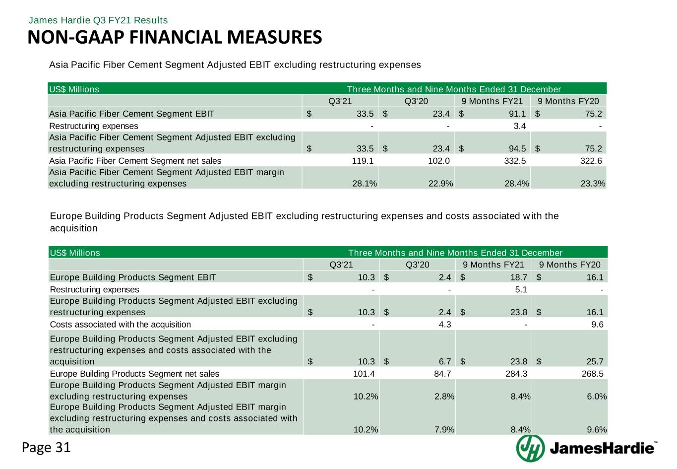 Page 31 James Hardie Q3 FY21 Results NON-GAAP FINANCIAL MEASURES US$ Millions Q3'21 Q3'20 9 Months FY21 9 Months FY20 Asia Pacific Fiber Cement Segment EBIT 33.5$ 23.4$ 91.1$ 75.2$ Restructuring expenses - - 3.4 - Asia Pacific Fiber Cement Segment Adjusted EBIT excluding restructuring expenses 33.5$ 23.4$ 94.5$ 75.2$ Asia Pacific Fiber Cement Segment net sales 119.1 102.0 332.5 322.6 Asia Pacific Fiber Cement Segment Adjusted EBIT margin excluding restructuring expenses 28.1% 22.9% 28.4% 23.3% Asia Pacific Fiber Cement Segment Adjusted EBIT excluding restructuring expenses Three Months and Nine Months Ended 31 December US$ Millions Q3'21 Q3'20 9 Months FY21 9 Months FY20 Europe Building Products Segment EBIT 10.3$ 2.4$ 18.7$ 16.1$ Restructuring expenses - - 5.1 - Europe Building Products Segment Adjusted EBIT excluding restructuring expenses 10.3$ 2.4$ 23.8$ 16.1$ Costs associated with the acquisition - 4.3 - 9.6 Europe Building Products Segment Adjusted EBIT excluding restructuring expenses and costs associated with the acquisition 10.3$ 6.7$ 23.8$ 25.7$ Europe Building Products Segment net sales 101.4 84.7 284.3 268.5 Europe Building Products Segment Adjusted EBIT margin excluding restructuring expenses 10.2% 2.8% 8.4% 6.0% Europe Building Products Segment Adjusted EBIT margin excluding restructuring expenses and costs associated with the acquisition 10.2% 7.9% 8.4% 9.6% Three Months and Nine Months Ended 31 December Europe Building Products Segment Adjusted EBIT excluding restructuring expenses and costs associated with the acquisition