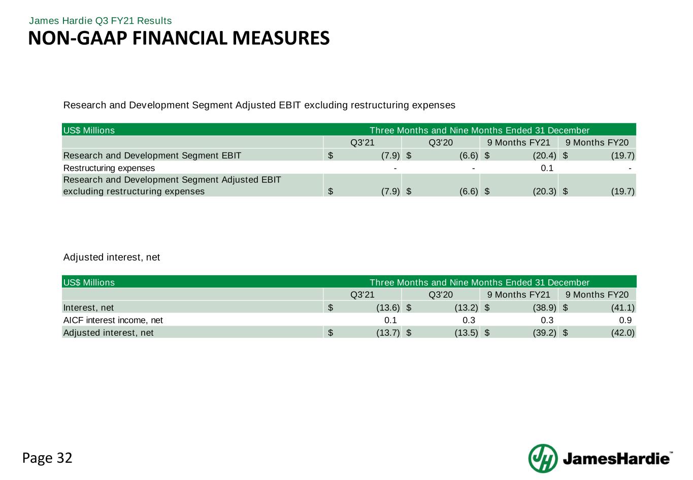 Page 32 James Hardie Q3 FY21 Results NON-GAAP FINANCIAL MEASURES US$ Millions Q3'21 Q3'20 9 Months FY21 9 Months FY20 Research and Development Segment EBIT (7.9)$ (6.6)$ (20.4)$ (19.7)$ Restructuring expenses - - 0.1 - Research and Development Segment Adjusted EBIT excluding restructuring expenses (7.9)$ (6.6)$ (20.3)$ (19.7)$ Research and Development Segment Adjusted EBIT excluding restructuring expenses Three Months and Nine Months Ended 31 December US$ Millions Q3'21 Q3'20 9 Months FY21 9 Months FY20 Interest, net (13.6)$ (13.2)$ (38.9)$ (41.1)$ AICF interest income, net 0.1 0.3 0.3 0.9 Adjusted interest, net (13.7)$ (13.5)$ (39.2)$ (42.0)$ Adjusted interest, net Three Months and Nine Months Ended 31 December
