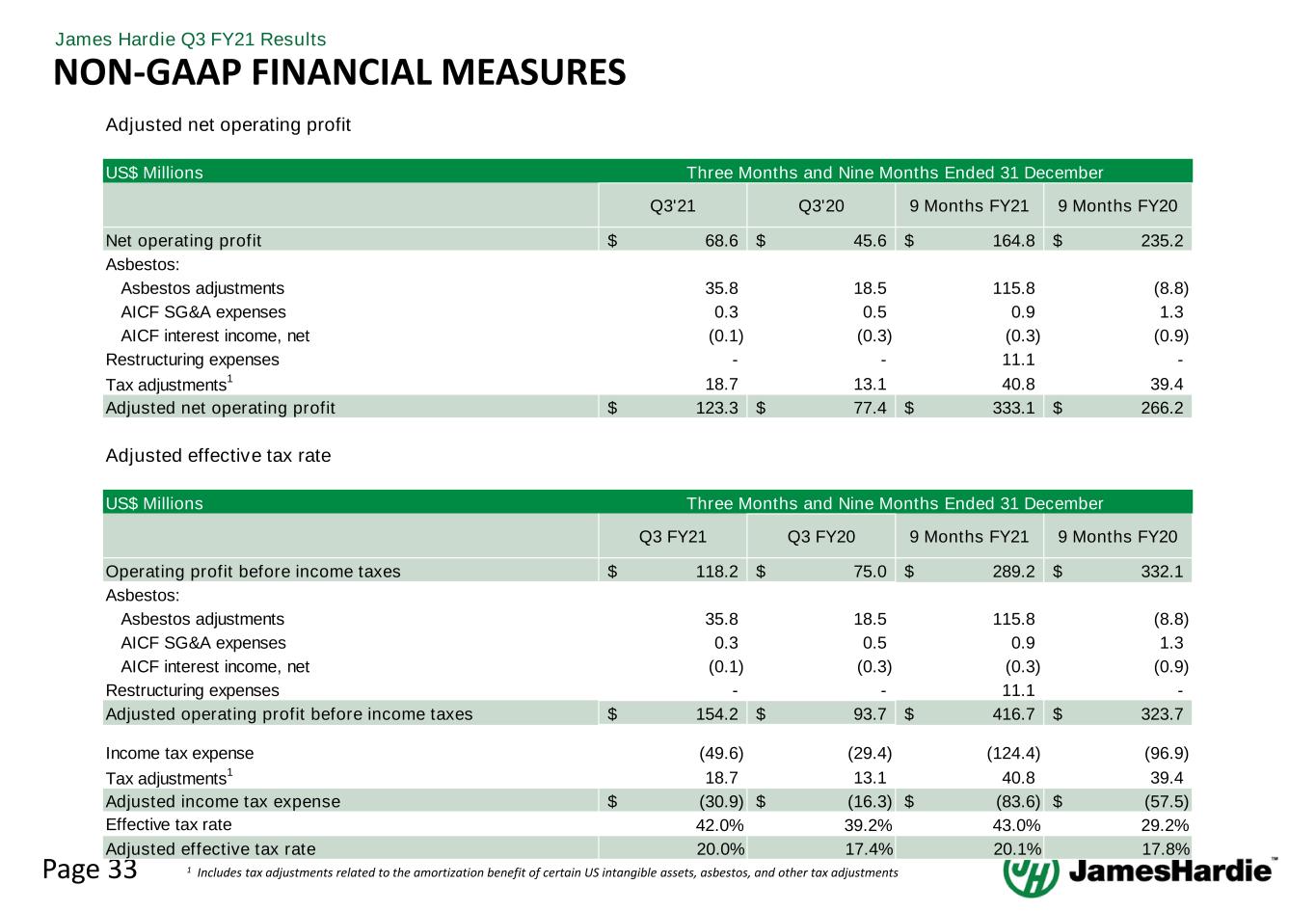 Page 33 James Hardie Q3 FY21 Results NON-GAAP FINANCIAL MEASURES 1 Includes tax adjustments related to the amortization benefit of certain US intangible assets, asbestos, and other tax adjustments Adjusted net operating profit US$ Millions Q3'21 Q3'20 9 Months FY21 9 Months FY20 Net operating profit 68.6$ 45.6$ 164.8$ 235.2$ Asbestos: Asbestos adjustments 35.8 18.5 115.8 (8.8) AICF SG&A expenses 0.3 0.5 0.9 1.3 AICF interest income, net (0.1) (0.3) (0.3) (0.9) Restructuring expenses - - 11.1 - Tax adjustments1 18.7 13.1 40.8 39.4 Adjusted net operating profit 123.3$ 77.4$ 333.1$ 266.2$ Three Months and Nine Months Ended 31 December Adjusted effective tax rate US$ Millions Q3 FY21 Q3 FY20 9 Months FY21 9 Months FY20 Operating profit before income taxes 118.2$ 75.0$ 289.2$ 332.1$ Asbestos: Asbestos adjustments 35.8 18.5 115.8 (8.8) AICF SG&A expenses 0.3 0.5 0.9 1.3 AICF interest income, net (0.1) (0.3) (0.3) (0.9) Restructuring expenses - - 11.1 - Adjusted operating profit before income taxes 154.2$ 93.7$ 416.7$ 323.7$ Income tax expense (49.6) (29.4) (124.4) (96.9) Tax adjustments1 18.7 13.1 40.8 39.4 Adjusted income tax expense (30.9)$ (16.3)$ (83.6)$ (57.5)$ Effective tax rate 42.0% 39.2% 43.0% 29.2% Adjusted effective tax rate 20.0% 17.4% 20.1% 17.8% Three Months and Nine Months Ended 31 December