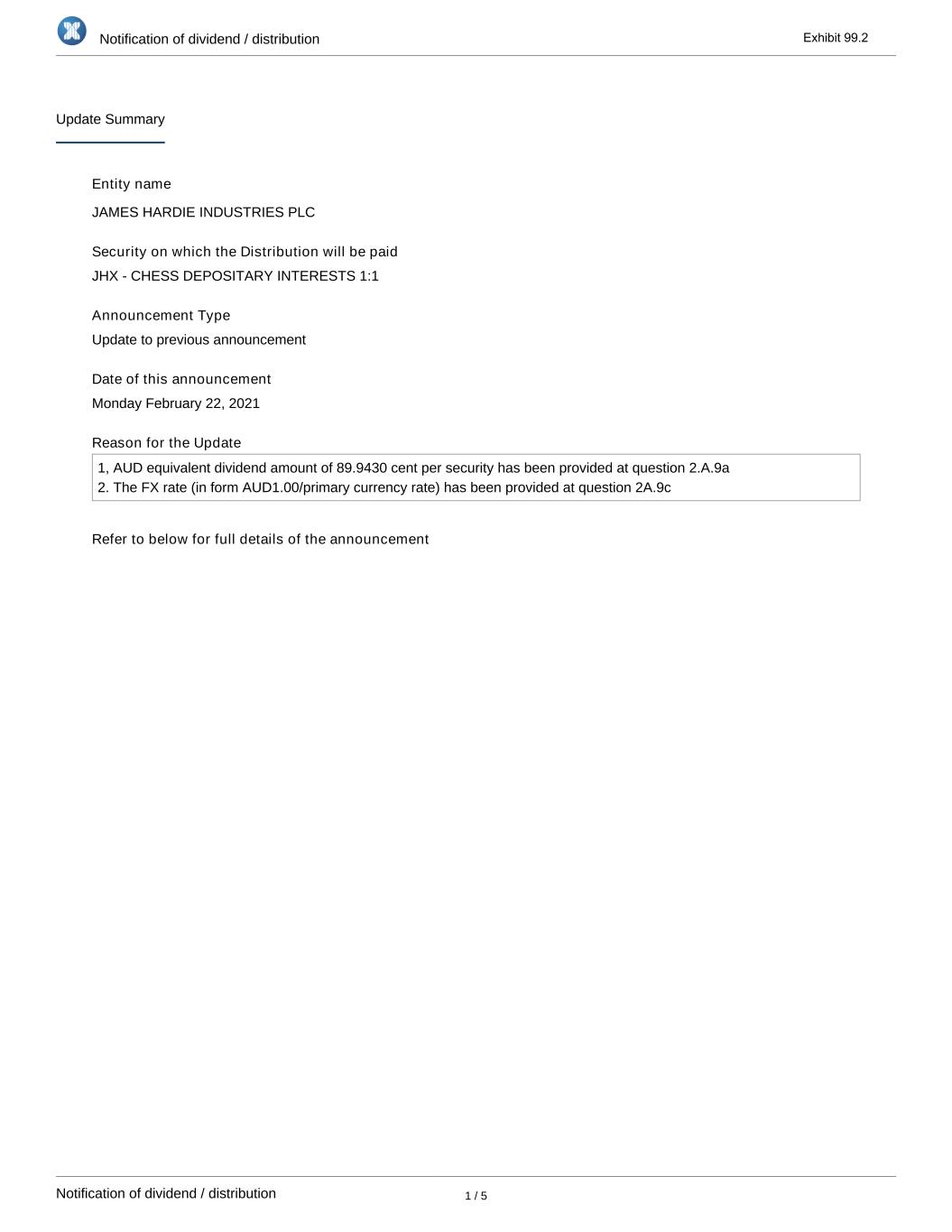 Notification of dividend / distribution Notification of dividend / distribution 1 / 5 Update Summary Entity name JAMES HARDIE INDUSTRIES PLC Security on which the Distribution will be paid JHX - CHESS DEPOSITARY INTERESTS 1:1 Announcement Type Update to previous announcement Date of this announcement Monday February 22, 2021 Reason for the Update 1, AUD equivalent dividend amount of 89.9430 cent per security has been provided at question 2.A.9a 2. The FX rate (in form AUD1.00/primary currency rate) has been provided at question 2A.9c Refer to below for full details of the announcement Exhibit 99.2