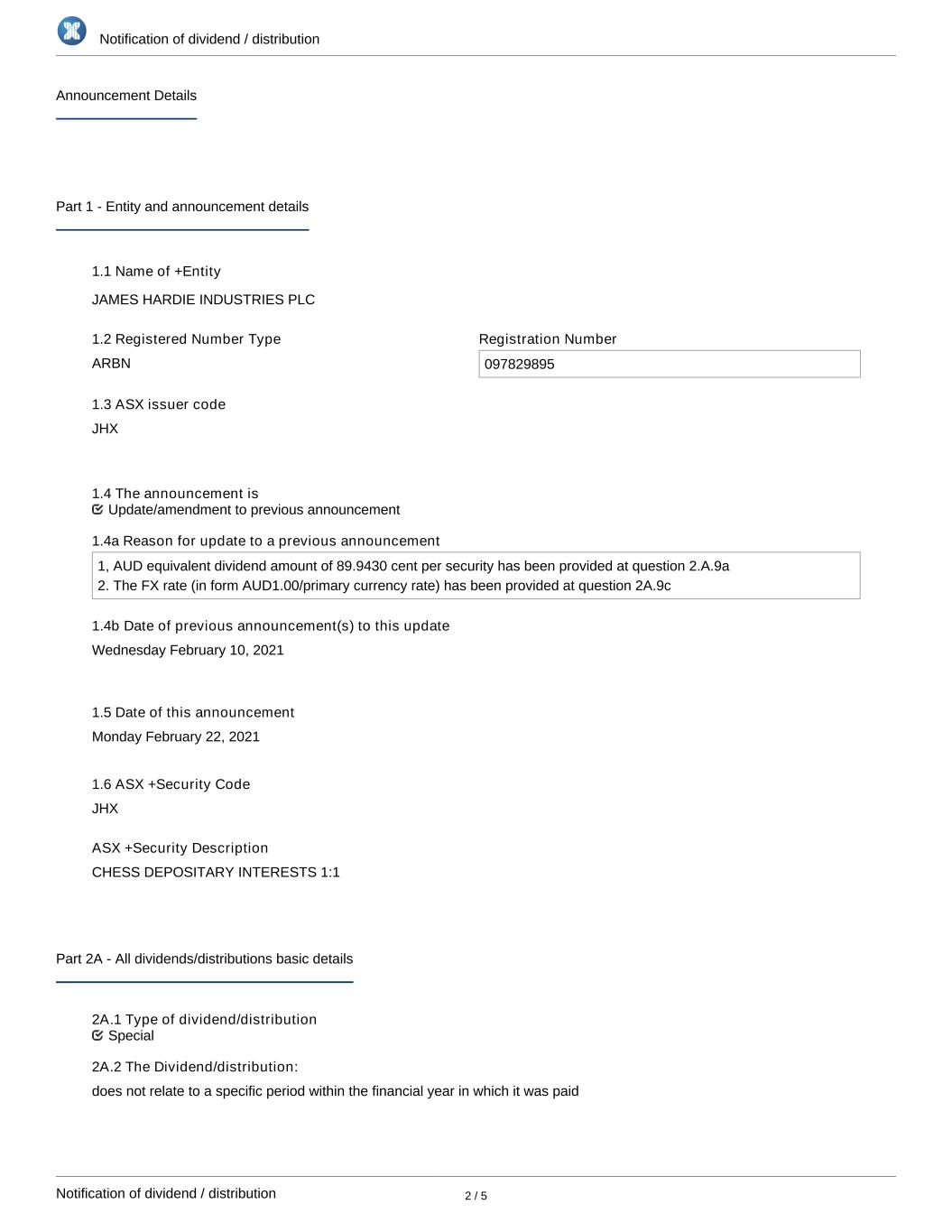 Notification of dividend / distribution Notification of dividend / distribution 2 / 5 Announcement Details Part 1 - Entity and announcement details 1.1 Name of +Entity JAMES HARDIE INDUSTRIES PLC 1.2 Registered Number Type ARBN Registration Number 097829895 1.3 ASX issuer code JHX 1.4 The announcement is 1.4a Reason for update to a previous announcement 1, AUD equivalent dividend amount of 89.9430 cent per security has been provided at question 2.A.9a 2. The FX rate (in form AUD1.00/primary currency rate) has been provided at question 2A.9c 1.4b Date of previous announcement(s) to this update Wednesday February 10, 2021 1.5 Date of this announcement Monday February 22, 2021 1.6 ASX +Security Code JHX ASX +Security Description CHESS DEPOSITARY INTERESTS 1:1 Part 2A - All dividends/distributions basic details 2A.1 Type of dividend/distribution 2A.2 The Dividend/distribution: does not relate to a specific period within the financial year in which it was paid Special Update/amendment to previous announcement