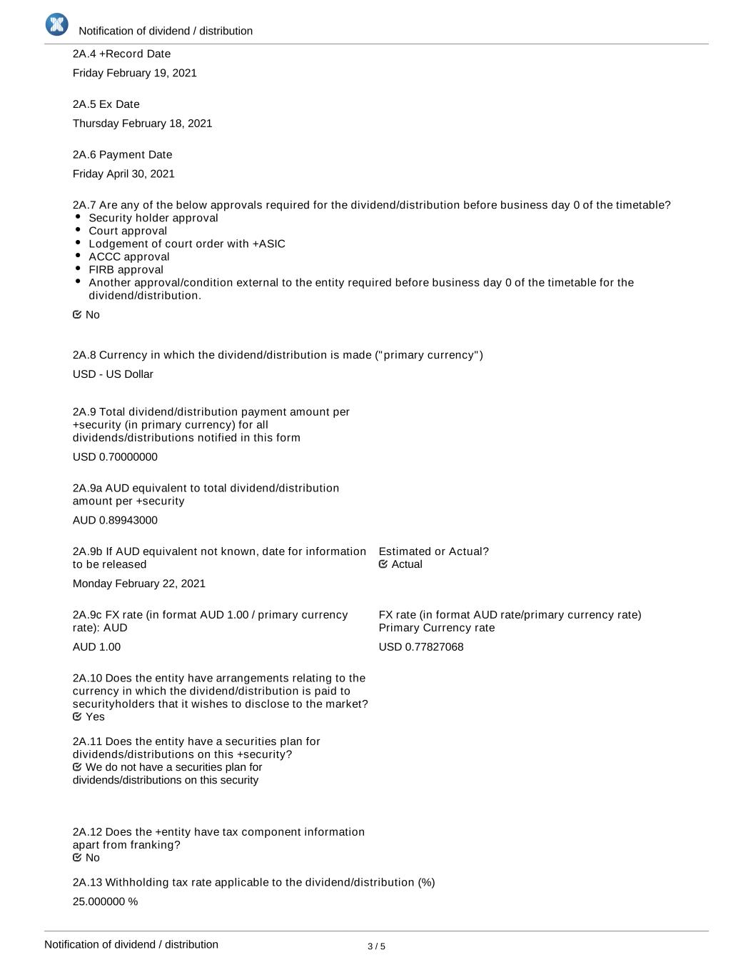 Notification of dividend / distribution Notification of dividend / distribution 3 / 5 2A.4 +Record Date Friday February 19, 2021 2A.5 Ex Date Thursday February 18, 2021 2A.6 Payment Date Friday April 30, 2021 2A.7 Are any of the below approvals required for the dividend/distribution before business day 0 of the timetable? Security holder approval Court approval Lodgement of court order with +ASIC ACCC approval FIRB approval Another approval/condition external to the entity required before business day 0 of the timetable for the dividend/distribution. 2A.8 Currency in which the dividend/distribution is made ("primary currency") USD - US Dollar 2A.9 Total dividend/distribution payment amount per +security (in primary currency) for all dividends/distributions notified in this form USD 0.70000000 2A.9a AUD equivalent to total dividend/distribution amount per +security AUD 0.89943000 2A.9b If AUD equivalent not known, date for information to be released Monday February 22, 2021 Estimated or Actual? 2A.9c FX rate (in format AUD 1.00 / primary currency rate): AUD AUD 1.00 FX rate (in format AUD rate/primary currency rate) Primary Currency rate USD 0.77827068 2A.10 Does the entity have arrangements relating to the currency in which the dividend/distribution is paid to securityholders that it wishes to disclose to the market? 2A.11 Does the entity have a securities plan for dividends/distributions on this +security? 2A.12 Does the +entity have tax component information apart from franking? 2A.13 Withholding tax rate applicable to the dividend/distribution (%) 25.000000 % No We do not have a securities plan for dividends/distributions on this security Yes Actual No