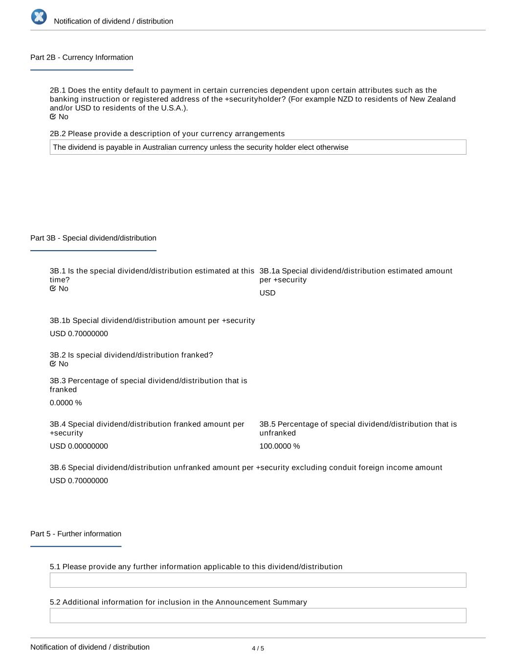 Notification of dividend / distribution Notification of dividend / distribution 4 / 5 Part 2B - Currency Information 2B.1 Does the entity default to payment in certain currencies dependent upon certain attributes such as the banking instruction or registered address of the +securityholder? (For example NZD to residents of New Zealand and/or USD to residents of the U.S.A.). 2B.2 Please provide a description of your currency arrangements The dividend is payable in Australian currency unless the security holder elect otherwise Part 3B - Special dividend/distribution 3B.1 Is the special dividend/distribution estimated at this time? 3B.1a Special dividend/distribution estimated amount per +security USD 3B.1b Special dividend/distribution amount per +security USD 0.70000000 3B.2 Is special dividend/distribution franked? 3B.3 Percentage of special dividend/distribution that is franked 0.0000 % 3B.4 Special dividend/distribution franked amount per +security USD 0.00000000 3B.5 Percentage of special dividend/distribution that is unfranked 100.0000 % 3B.6 Special dividend/distribution unfranked amount per +security excluding conduit foreign income amount USD 0.70000000 Part 5 - Further information 5.1 Please provide any further information applicable to this dividend/distribution 5.2 Additional information for inclusion in the Announcement Summary No No No