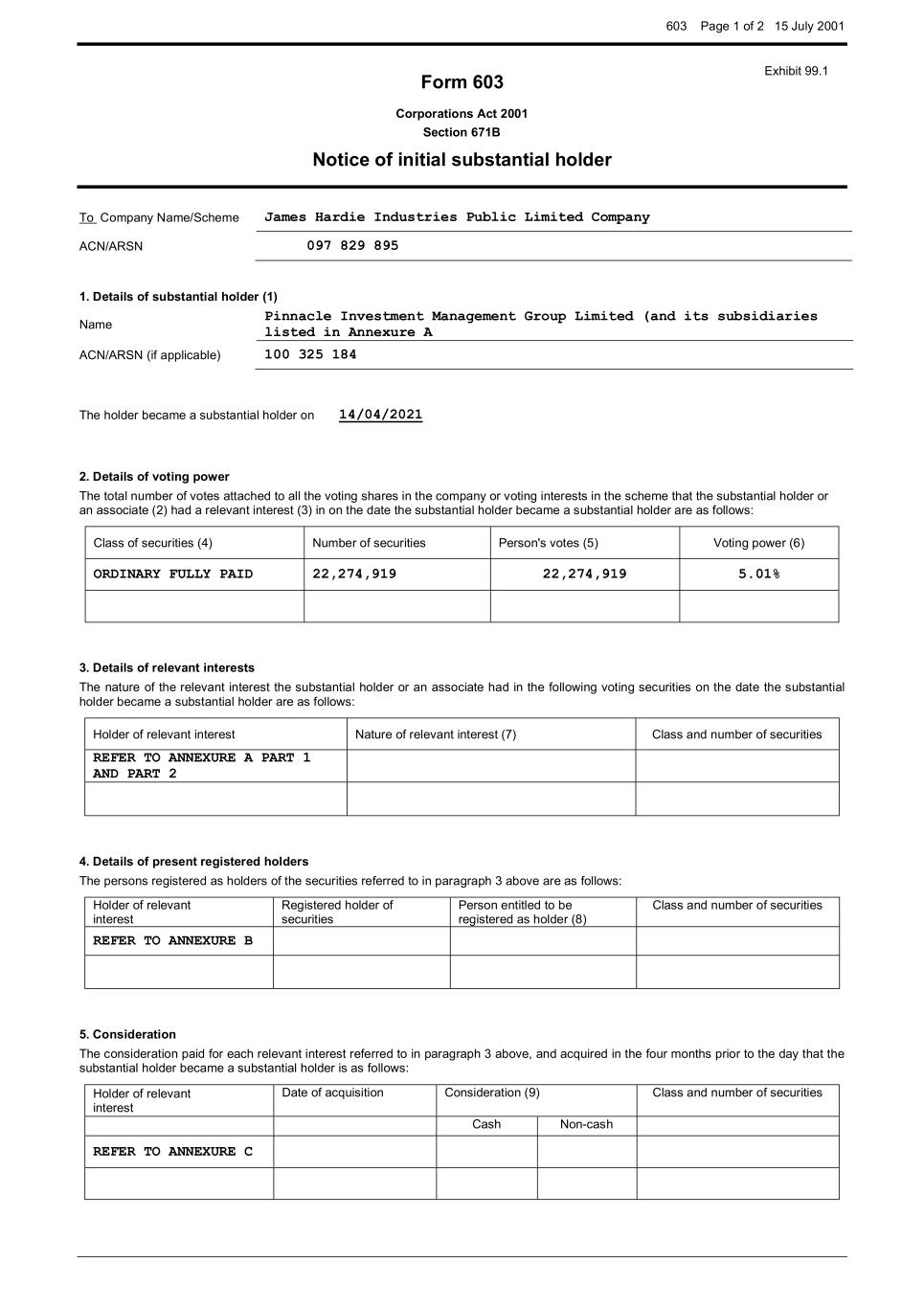 603 Page 1 of 2 15 July 2001 Form 603 Corporations Act 2001 Section 671B Notice of initial substantial holder To Company Name/Scheme James Hardie Industries Public Limited Company ACN/ARSN 097 829 895 1. Details of substantial holder (1) Name Pinnacle Investment Management Group Limited (and its subsidiaries listed in Annexure A ACN/ARSN (if applicable) 100 325 184 The holder became a substantial holder on 14/04/2021 2. Details of voting power The total number of votes attached to all the voting shares in the company or voting interests in the scheme that the substantial holder or an associate (2) had a relevant interest (3) in on the date the substantial holder became a substantial holder are as follows: Class of securities (4) Number of securities Person's votes (5) Voting power (6) ORDINARY FULLY PAID 22,274,919 22,274,919 5.01% 3. Details of relevant interests The nature of the relevant interest the substantial holder or an associate had in the following voting securities on the date the substantial holder became a substantial holder are as follows: Holder of relevant interest Nature of relevant interest (7) Class and number of securities REFER TO ANNEXURE A PART 1 AND PART 2 4. Details of present registered holders The persons registered as holders of the securities referred to in paragraph 3 above are as follows: Holder of relevant interest Registered holder of securities Person entitled to be registered as holder (8) Class and number of securities REFER TO ANNEXURE B 5. Consideration The consideration paid for each relevant interest referred to in paragraph 3 above, and acquired in the four months prior to the day that the substantial holder became a substantial holder is as follows: Holder of relevant interest Date of acquisition Consideration (9) Class and number of securities Cash Non-cash REFER TO ANNEXURE C Exhibit 99.1
