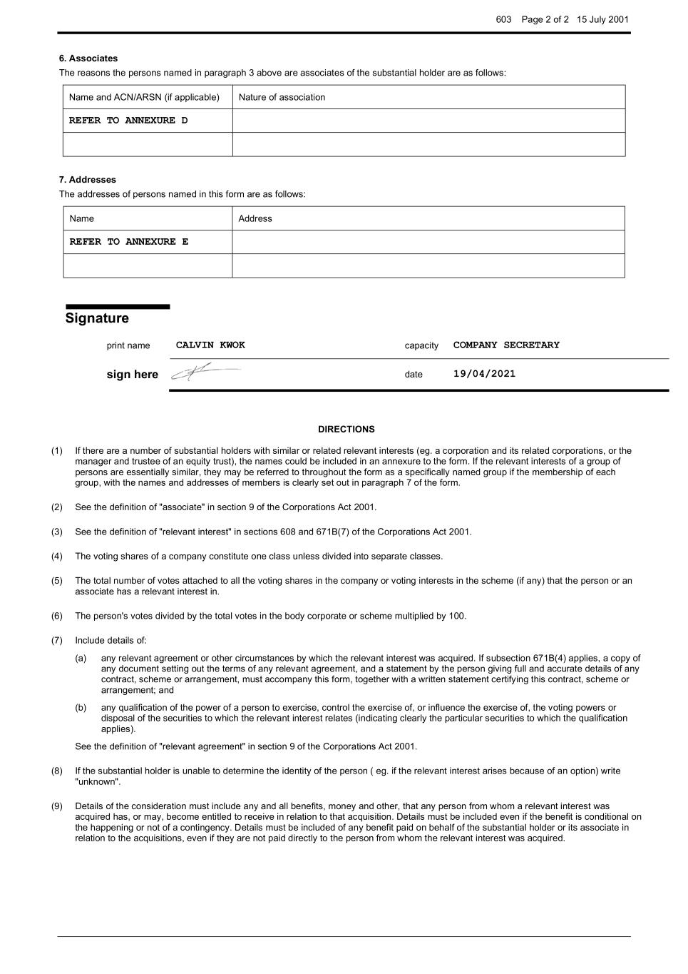 603 Page 2 of 2 15 July 2001 6. Associates The reasons the persons named in paragraph 3 above are associates of the substantial holder are as follows: Name and ACN/ARSN (if applicable) Nature of association REFER TO ANNEXURE D 7. Addresses The addresses of persons named in this form are as follows: Name Address REFER TO ANNEXURE E Signature print name CALVIN KWOK capacity COMPANY SECRETARY sign here date 19/04/2021 DIRECTIONS (1) If there are a number of substantial holders with similar or related relevant interests (eg. a corporation and its related corporations, or the manager and trustee of an equity trust), the names could be included in an annexure to the form. If the relevant interests of a group of persons are essentially similar, they may be referred to throughout the form as a specifically named group if the membership of each group, with the names and addresses of members is clearly set out in paragraph 7 of the form. (2) See the definition of "associate" in section 9 of the Corporations Act 2001. (3) See the definition of "relevant interest" in sections 608 and 671B(7) of the Corporations Act 2001. (4) The voting shares of a company constitute one class unless divided into separate classes. (5) The total number of votes attached to all the voting shares in the company or voting interests in the scheme (if any) that the person or an associate has a relevant interest in. (6) The person's votes divided by the total votes in the body corporate or scheme multiplied by 100. (7) Include details of: (a) any relevant agreement or other circumstances by which the relevant interest was acquired. If subsection 671B(4) applies, a copy of any document setting out the terms of any relevant agreement, and a statement by the person giving full and accurate details of any contract, scheme or arrangement, must accompany this form, together with a written statement certifying this contract, scheme or arrangement; and (b) any qualification of the power of a person to exercise, control the exercise of, or influence the exercise of, the voting powers or disposal of the securities to which the relevant interest relates (indicating clearly the particular securities to which the qualification applies). See the definition of "relevant agreement" in section 9 of the Corporations Act 2001. (8) If the substantial holder is unable to determine the identity of the person ( eg. if the relevant interest arises because of an option) write "unknown". (9) Details of the consideration must include any and all benefits, money and other, that any person from whom a relevant interest was acquired has, or may, become entitled to receive in relation to that acquisition. Details must be included even if the benefit is conditional on the happening or not of a contingency. Details must be included of any benefit paid on behalf of the substantial holder or its associate in relation to the acquisitions, even if they are not paid directly to the person from whom the relevant interest was acquired.
