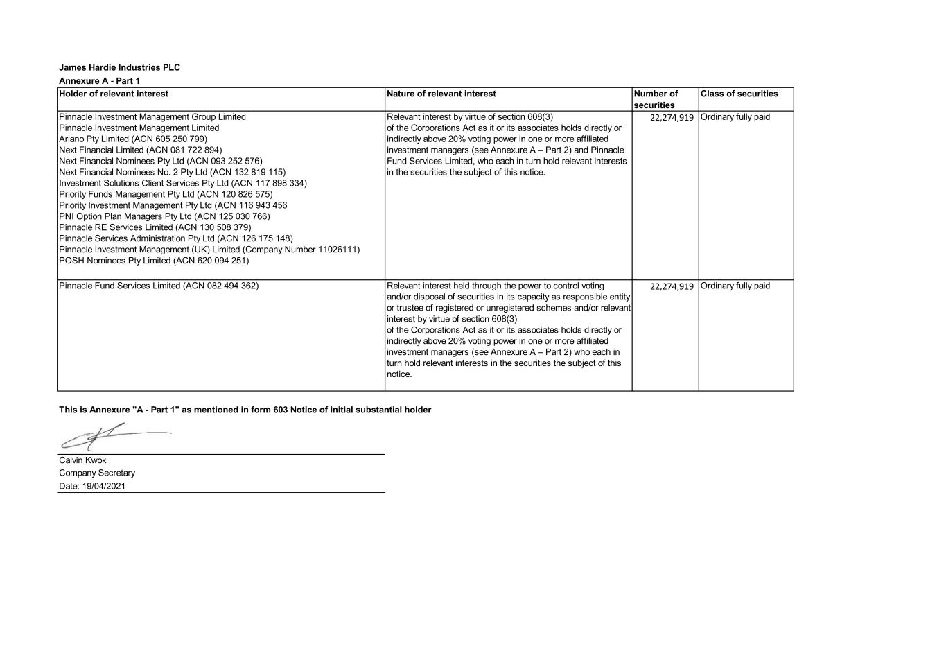 James Hardie Industries PLC Annexure A - Part 1 Holder of relevant interest Nature of relevant interest Number of securities Class of securities Pinnacle Investment Management Group Limited Pinnacle Investment Management Limited Ariano Pty Limited (ACN 605 250 799) Next Financial Limited (ACN 081 722 894) Next Financial Nominees Pty Ltd (ACN 093 252 576) Next Financial Nominees No. 2 Pty Ltd (ACN 132 819 115) Investment Solutions Client Services Pty Ltd (ACN 117 898 334) Priority Funds Management Pty Ltd (ACN 120 826 575) Priority Investment Management Pty Ltd (ACN 116 943 456 PNI Option Plan Managers Pty Ltd (ACN 125 030 766) Pinnacle RE Services Limited (ACN 130 508 379) Pinnacle Services Administration Pty Ltd (ACN 126 175 148) Pinnacle Investment Management (UK) Limited (Company Number 11026111) POSH Nominees Pty Limited (ACN 620 094 251) Relevant interest by virtue of section 608(3) of the Corporations Act as it or its associates holds directly or indirectly above 20% voting power in one or more affiliated investment managers (see Annexure A – Part 2) and Pinnacle Fund Services Limited, who each in turn hold relevant interests in the securities the subject of this notice. 22,274,919 Ordinary fully paid Pinnacle Fund Services Limited (ACN 082 494 362) Relevant interest held through the power to control voting and/or disposal of securities in its capacity as responsible entity or trustee of registered or unregistered schemes and/or relevant interest by virtue of section 608(3) of the Corporations Act as it or its associates holds directly or indirectly above 20% voting power in one or more affiliated investment managers (see Annexure A – Part 2) who each in turn hold relevant interests in the securities the subject of this notice. 22,274,919 Ordinary fully paid This is Annexure "A - Part 1" as mentioned in form 603 Notice of initial substantial holder Calvin Kwok Company Secretary Date: 19/04/2021