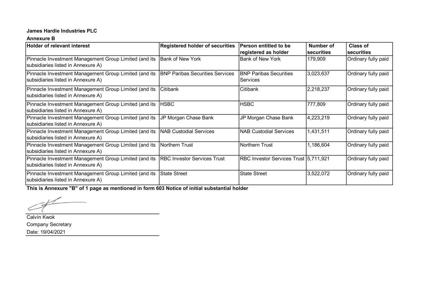 James Hardie Industries PLC Annexure B Holder of relevant interest Registered holder of securities Person entitled to be registered as holder Number of securities Class of securities Pinnacle Investment Management Group Limited (and its subsidiaries listed in Annexure A) Bank of New York Bank of New York 179,909 Ordinary fully paid Pinnacle Investment Management Group Limited (and its subsidiaries listed in Annexure A) BNP Paribas Securities Services BNP Paribas Securities Services 3,023,637 Ordinary fully paid Pinnacle Investment Management Group Limited (and its subsidiaries listed in Annexure A) Citibank Citibank 2,218,237 Ordinary fully paid Pinnacle Investment Management Group Limited (and its subsidiaries listed in Annexure A) HSBC HSBC 777,809 Ordinary fully paid Pinnacle Investment Management Group Limited (and its subsidiaries listed in Annexure A) JP Morgan Chase Bank JP Morgan Chase Bank 4,223,219 Ordinary fully paid Pinnacle Investment Management Group Limited (and its subsidiaries listed in Annexure A) NAB Custodial Services NAB Custodial Services 1,431,511 Ordinary fully paid Pinnacle Investment Management Group Limited (and its subsidiaries listed in Annexure A) Northern Trust Northern Trust 1,186,604 Ordinary fully paid Pinnacle Investment Management Group Limited (and its subsidiaries listed in Annexure A) RBC Investor Services Trust RBC Investor Services Trust 5,711,921 Ordinary fully paid Pinnacle Investment Management Group Limited (and its subsidiaries listed in Annexure A) State Street State Street 3,522,072 Ordinary fully paid This is Annexure "B" of 1 page as mentioned in form 603 Notice of initial substantial holder Calvin Kwok Company Secretary Date: 19/04/2021