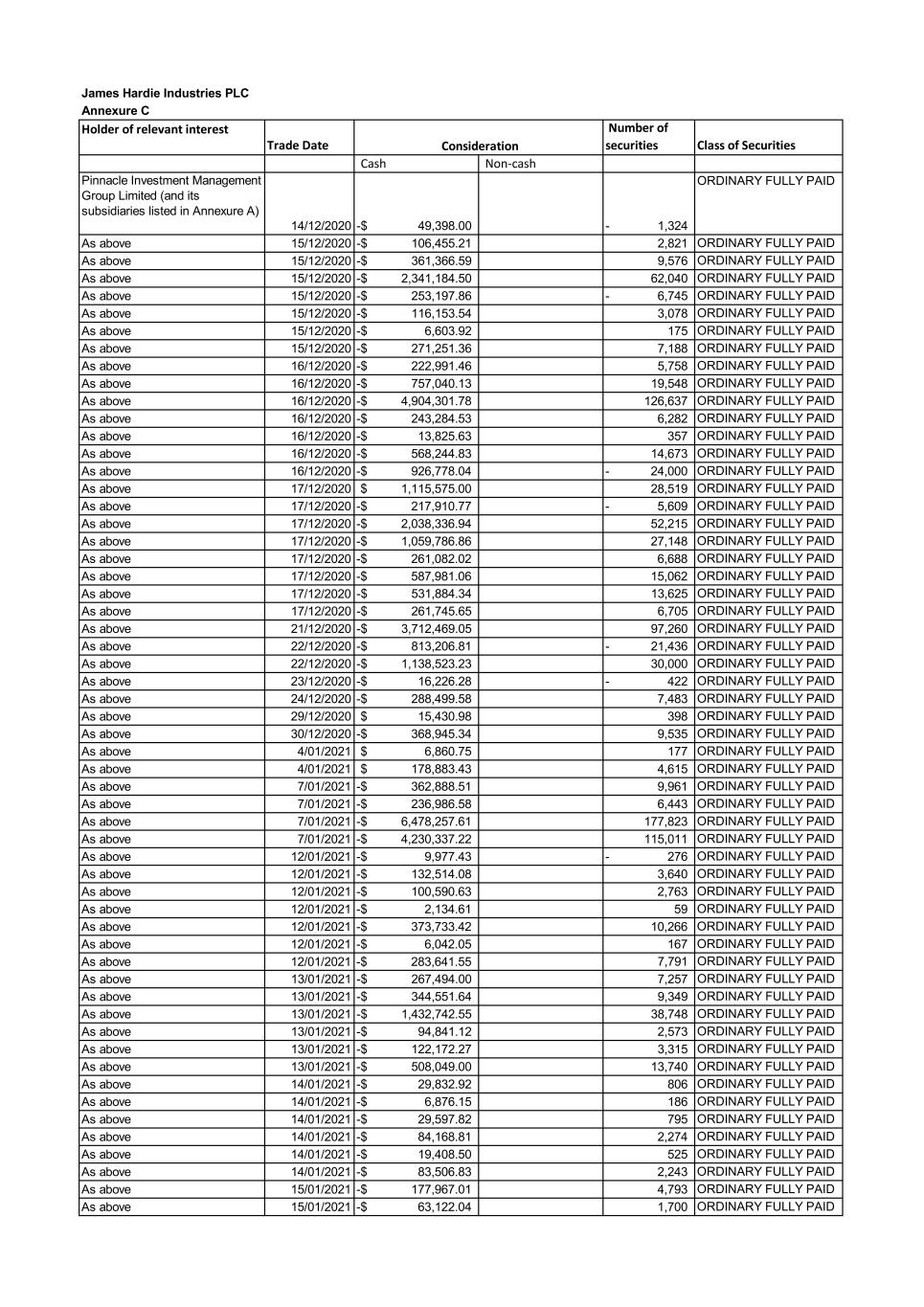 James Hardie Industries PLC Annexure C Holder of relevant interest Trade Date Number of securities Class of Securities Cash Non-cash Pinnacle Investment Management Group Limited (and its subsidiaries listed in Annexure A) 14/12/2020 49,398.00-$ 1,324- ORDINARY FULLY PAID As above 15/12/2020 106,455.21-$ 2,821 ORDINARY FULLY PAID As above 15/12/2020 361,366.59-$ 9,576 ORDINARY FULLY PAID As above 15/12/2020 2,341,184.50-$ 62,040 ORDINARY FULLY PAID As above 15/12/2020 253,197.86-$ 6,745- ORDINARY FULLY PAID As above 15/12/2020 116,153.54-$ 3,078 ORDINARY FULLY PAID As above 15/12/2020 6,603.92-$ 175 ORDINARY FULLY PAID As above 15/12/2020 271,251.36-$ 7,188 ORDINARY FULLY PAID As above 16/12/2020 222,991.46-$ 5,758 ORDINARY FULLY PAID As above 16/12/2020 757,040.13-$ 19,548 ORDINARY FULLY PAID As above 16/12/2020 4,904,301.78-$ 126,637 ORDINARY FULLY PAID As above 16/12/2020 243,284.53-$ 6,282 ORDINARY FULLY PAID As above 16/12/2020 13,825.63-$ 357 ORDINARY FULLY PAID As above 16/12/2020 568,244.83-$ 14,673 ORDINARY FULLY PAID As above 16/12/2020 926,778.04-$ 24,000- ORDINARY FULLY PAID As above 17/12/2020 1,115,575.00$ 28,519 ORDINARY FULLY PAID As above 17/12/2020 217,910.77-$ 5,609- ORDINARY FULLY PAID As above 17/12/2020 2,038,336.94-$ 52,215 ORDINARY FULLY PAID As above 17/12/2020 1,059,786.86-$ 27,148 ORDINARY FULLY PAID As above 17/12/2020 261,082.02-$ 6,688 ORDINARY FULLY PAID As above 17/12/2020 587,981.06-$ 15,062 ORDINARY FULLY PAID As above 17/12/2020 531,884.34-$ 13,625 ORDINARY FULLY PAID As above 17/12/2020 261,745.65-$ 6,705 ORDINARY FULLY PAID As above 21/12/2020 3,712,469.05-$ 97,260 ORDINARY FULLY PAID As above 22/12/2020 813,206.81-$ 21,436- ORDINARY FULLY PAID As above 22/12/2020 1,138,523.23-$ 30,000 ORDINARY FULLY PAID As above 23/12/2020 16,226.28-$ 422- ORDINARY FULLY PAID As above 24/12/2020 288,499.58-$ 7,483 ORDINARY FULLY PAID As above 29/12/2020 15,430.98$ 398 ORDINARY FULLY PAID As above 30/12/2020 368,945.34-$ 9,535 ORDINARY FULLY PAID As above 4/01/2021 6,860.75$ 177 ORDINARY FULLY PAID As above 4/01/2021 178,883.43$ 4,615 ORDINARY FULLY PAID As above 7/01/2021 362,888.51-$ 9,961 ORDINARY FULLY PAID As above 7/01/2021 236,986.58-$ 6,443 ORDINARY FULLY PAID As above 7/01/2021 6,478,257.61-$ 177,823 ORDINARY FULLY PAID As above 7/01/2021 4,230,337.22-$ 115,011 ORDINARY FULLY PAID As above 12/01/2021 9,977.43-$ 276- ORDINARY FULLY PAID As above 12/01/2021 132,514.08-$ 3,640 ORDINARY FULLY PAID As above 12/01/2021 100,590.63-$ 2,763 ORDINARY FULLY PAID As above 12/01/2021 2,134.61-$ 59 ORDINARY FULLY PAID As above 12/01/2021 373,733.42-$ 10,266 ORDINARY FULLY PAID As above 12/01/2021 6,042.05-$ 167 ORDINARY FULLY PAID As above 12/01/2021 283,641.55-$ 7,791 ORDINARY FULLY PAID As above 13/01/2021 267,494.00-$ 7,257 ORDINARY FULLY PAID As above 13/01/2021 344,551.64-$ 9,349 ORDINARY FULLY PAID As above 13/01/2021 1,432,742.55-$ 38,748 ORDINARY FULLY PAID As above 13/01/2021 94,841.12-$ 2,573 ORDINARY FULLY PAID As above 13/01/2021 122,172.27-$ 3,315 ORDINARY FULLY PAID As above 13/01/2021 508,049.00-$ 13,740 ORDINARY FULLY PAID As above 14/01/2021 29,832.92-$ 806 ORDINARY FULLY PAID As above 14/01/2021 6,876.15-$ 186 ORDINARY FULLY PAID As above 14/01/2021 29,597.82-$ 795 ORDINARY FULLY PAID As above 14/01/2021 84,168.81-$ 2,274 ORDINARY FULLY PAID As above 14/01/2021 19,408.50-$ 525 ORDINARY FULLY PAID As above 14/01/2021 83,506.83-$ 2,243 ORDINARY FULLY PAID As above 15/01/2021 177,967.01-$ 4,793 ORDINARY FULLY PAID As above 15/01/2021 63,122.04-$ 1,700 ORDINARY FULLY PAID Consideration