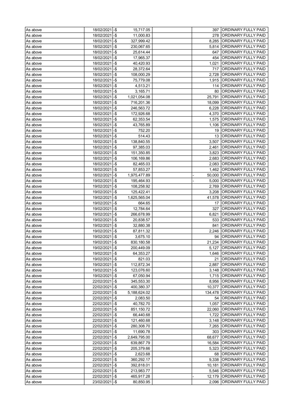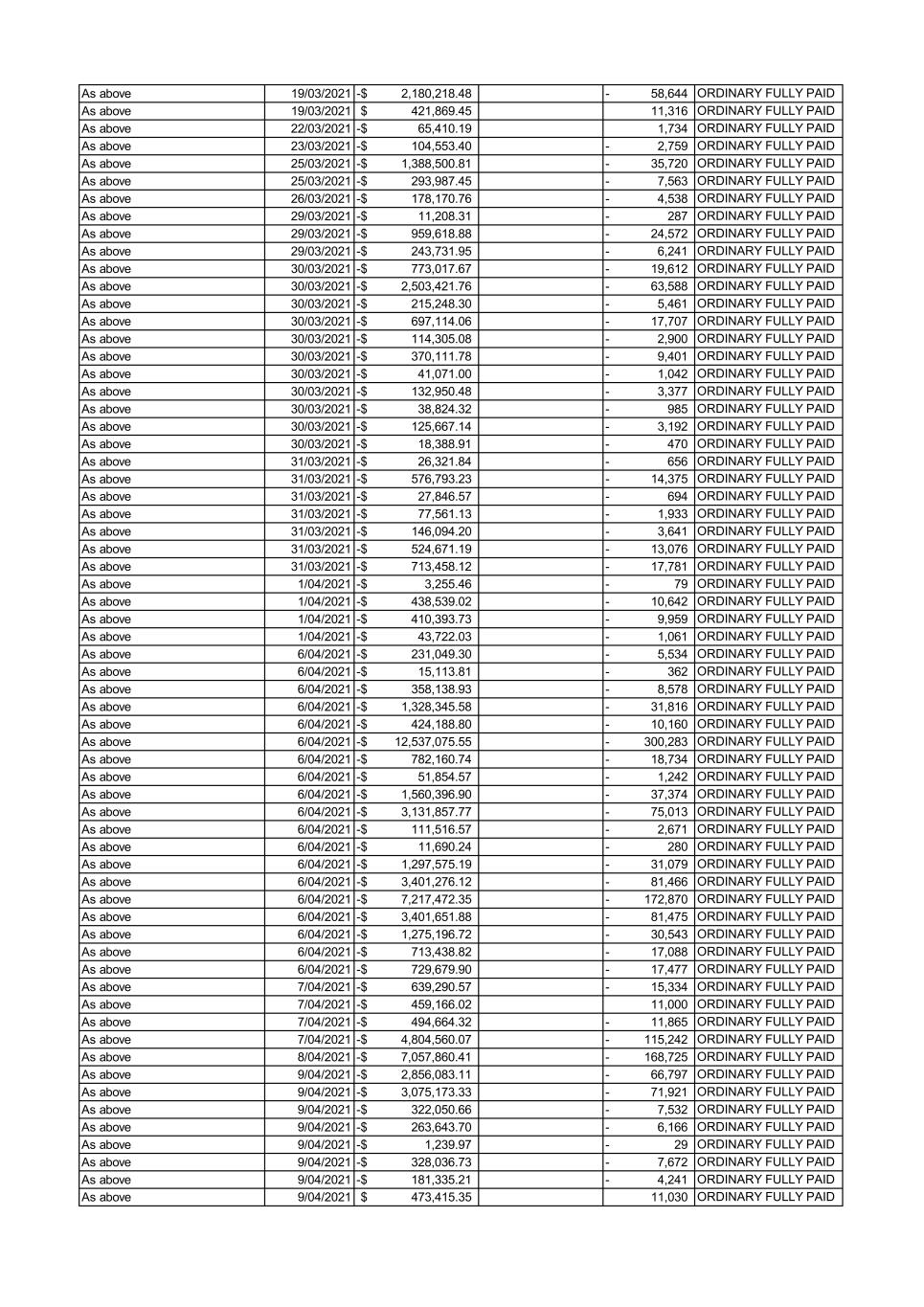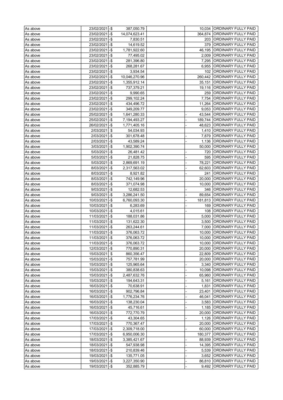 As above 9/02/2021 414,260.56-$ 10,000 ORDINARY FULLY PAID As above 9/02/2021 1,118,503.52-$ 27,000 ORDINARY FULLY PAID As above 9/02/2021 497,112.68-$ 12,000 ORDINARY FULLY PAID As above 9/02/2021 414,260.56-$ 10,000 ORDINARY FULLY PAID As above 9/02/2021 1,242,781.69-$ 30,000 ORDINARY FULLY PAID As above 10/02/2021 1,653,024.67-$ 40,000 ORDINARY FULLY PAID As above 10/02/2021 1,115,791.65-$ 27,000 ORDINARY FULLY PAID As above 10/02/2021 259,584.37-$ 6,301- ORDINARY FULLY PAID As above 10/02/2021 413,256.16-$ 10,000 ORDINARY FULLY PAID As above 10/02/2021 609,449.73-$ 14,715 ORDINARY FULLY PAID As above 10/02/2021 170,057.80-$ 4,106 ORDINARY FULLY PAID As above 10/02/2021 1,580,800.34-$ 38,168 ORDINARY FULLY PAID As above 10/02/2021 289.92-$ 7 ORDINARY FULLY PAID As above 10/02/2021 212,137.38-$ 5,122 ORDINARY FULLY PAID As above 10/02/2021 34,955.86-$ 844 ORDINARY FULLY PAID As above 10/02/2021 38,062.13-$ 919 ORDINARY FULLY PAID As above 10/02/2021 119,404.93-$ 2,883 ORDINARY FULLY PAID As above 10/02/2021 6,129.70-$ 148 ORDINARY FULLY PAID As above 10/02/2021 741,942.40-$ 17,914 ORDINARY FULLY PAID As above 10/02/2021 205,345.00-$ 4,958 ORDINARY FULLY PAID As above 10/02/2021 69,083.39-$ 1,668 ORDINARY FULLY PAID As above 10/02/2021 621.26-$ 15 ORDINARY FULLY PAID As above 10/02/2021 154,609.30-$ 3,733 ORDINARY FULLY PAID As above 10/02/2021 174,448.00-$ 4,212 ORDINARY FULLY PAID As above 10/02/2021 76,414.18-$ 1,845 ORDINARY FULLY PAID As above 11/02/2021 204,329.50-$ 5,042 ORDINARY FULLY PAID As above 11/02/2021 196,888.12-$ 4,835 ORDINARY FULLY PAID As above 11/02/2021 48,265.86-$ 1,191 ORDINARY FULLY PAID As above 11/02/2021 46,503.87-$ 1,142 ORDINARY FULLY PAID As above 11/02/2021 57,019.36-$ 1,407 ORDINARY FULLY PAID As above 11/02/2021 54,933.21-$ 1,349 ORDINARY FULLY PAID As above 11/02/2021 529,992.29-$ 13,078 ORDINARY FULLY PAID As above 11/02/2021 510,728.18-$ 12,542 ORDINARY FULLY PAID As above 11/02/2021 81.05-$ 2 ORDINARY FULLY PAID As above 11/02/2021 81.44-$ 2 ORDINARY FULLY PAID As above 11/02/2021 71,122.23-$ 1,755 ORDINARY FULLY PAID As above 11/02/2021 68,534.16-$ 1,683 ORDINARY FULLY PAID As above 11/02/2021 11,711.87-$ 289 ORDINARY FULLY PAID As above 11/02/2021 11,279.84-$ 277 ORDINARY FULLY PAID As above 11/02/2021 12,765.53-$ 315 ORDINARY FULLY PAID As above 11/02/2021 12,297.87-$ 302 ORDINARY FULLY PAID As above 11/02/2021 49,441.09-$ 1,220 ORDINARY FULLY PAID As above 11/02/2021 47,603.35-$ 1,169 ORDINARY FULLY PAID As above 11/02/2021 2,066.80-$ 51 ORDINARY FULLY PAID As above 11/02/2021 1,995.35-$ 49 ORDINARY FULLY PAID As above 11/02/2021 359,015.28-$ 8,859 ORDINARY FULLY PAID As above 11/02/2021 345,928.55-$ 8,495 ORDINARY FULLY PAID As above 11/02/2021 68,852.79-$ 1,699 ORDINARY FULLY PAID As above 11/02/2021 66,335.21-$ 1,629 ORDINARY FULLY PAID As above 11/02/2021 23,180.58-$ 572 ORDINARY FULLY PAID As above 11/02/2021 22,315.35-$ 548 ORDINARY FULLY PAID As above 11/02/2021 202.63-$ 5 ORDINARY FULLY PAID As above 11/02/2021 203.60-$ 5 ORDINARY FULLY PAID As above 11/02/2021 51,832.10-$ 1,279 ORDINARY FULLY PAID As above 11/02/2021 49,965.19-$ 1,227 ORDINARY FULLY PAID As above 11/02/2021 58,478.28-$ 1,443 ORDINARY FULLY PAID As above 11/02/2021 56,358.46-$ 1,384 ORDINARY FULLY PAID As above 11/02/2021 25,612.11-$ 632 ORDINARY FULLY PAID As above 11/02/2021 24,677.19-$ 606 ORDINARY FULLY PAID As above 11/02/2021 1,626,490.08-$ 40,000 ORDINARY FULLY PAID As above 12/02/2021 36,428.50$ 895 ORDINARY FULLY PAID As above 12/02/2021 36,424.50-$ 895- ORDINARY FULLY PAID As above 12/02/2021 152,933.34-$ 3,752 ORDINARY FULLY PAID As above 12/02/2021 36,113.79-$ 886 ORDINARY FULLY PAID