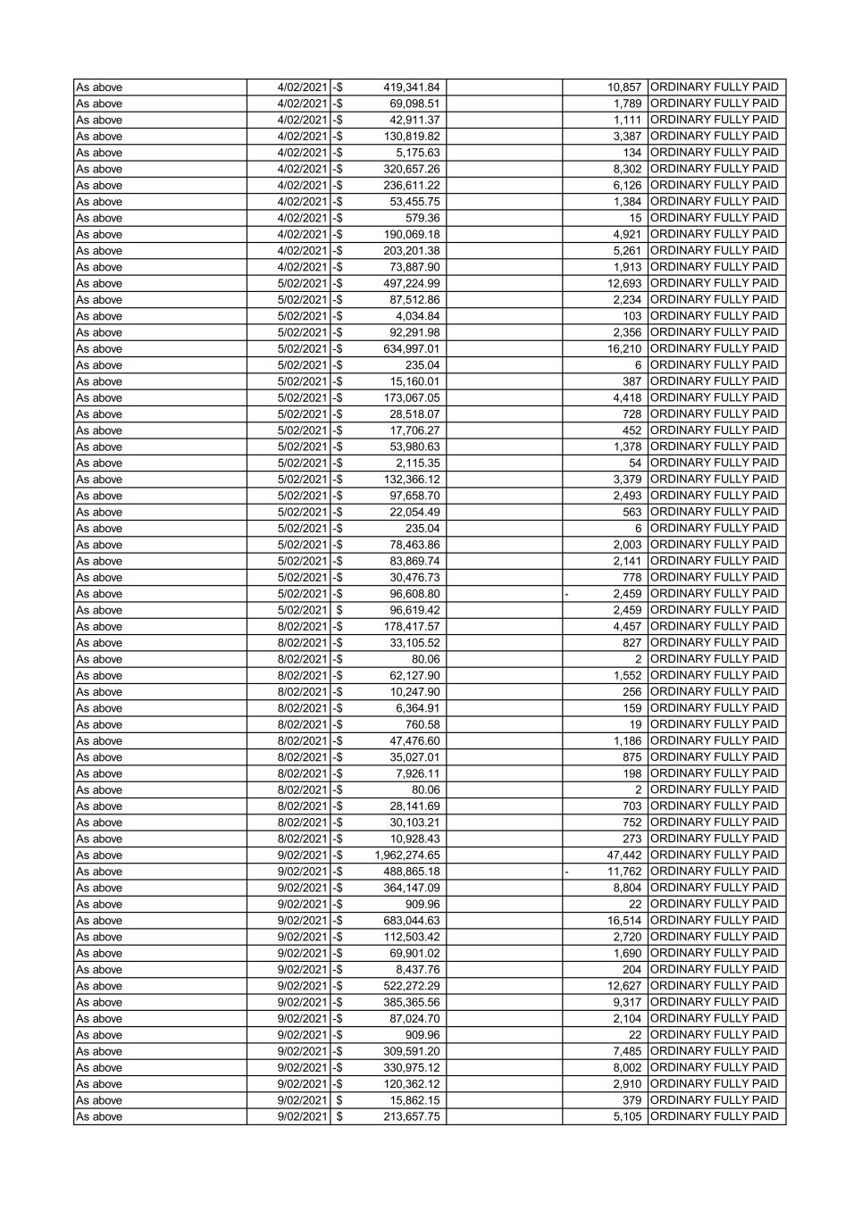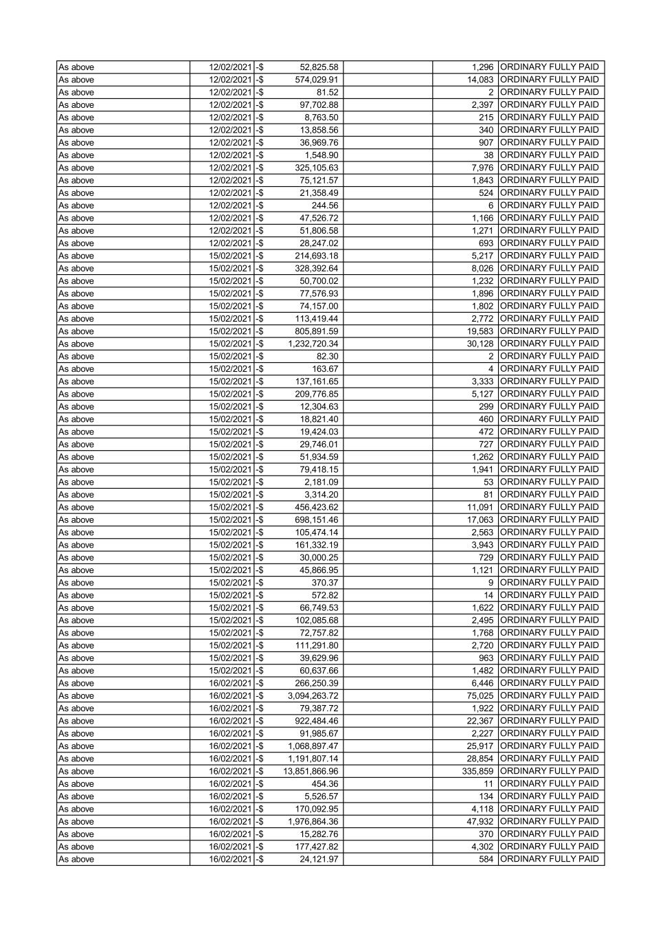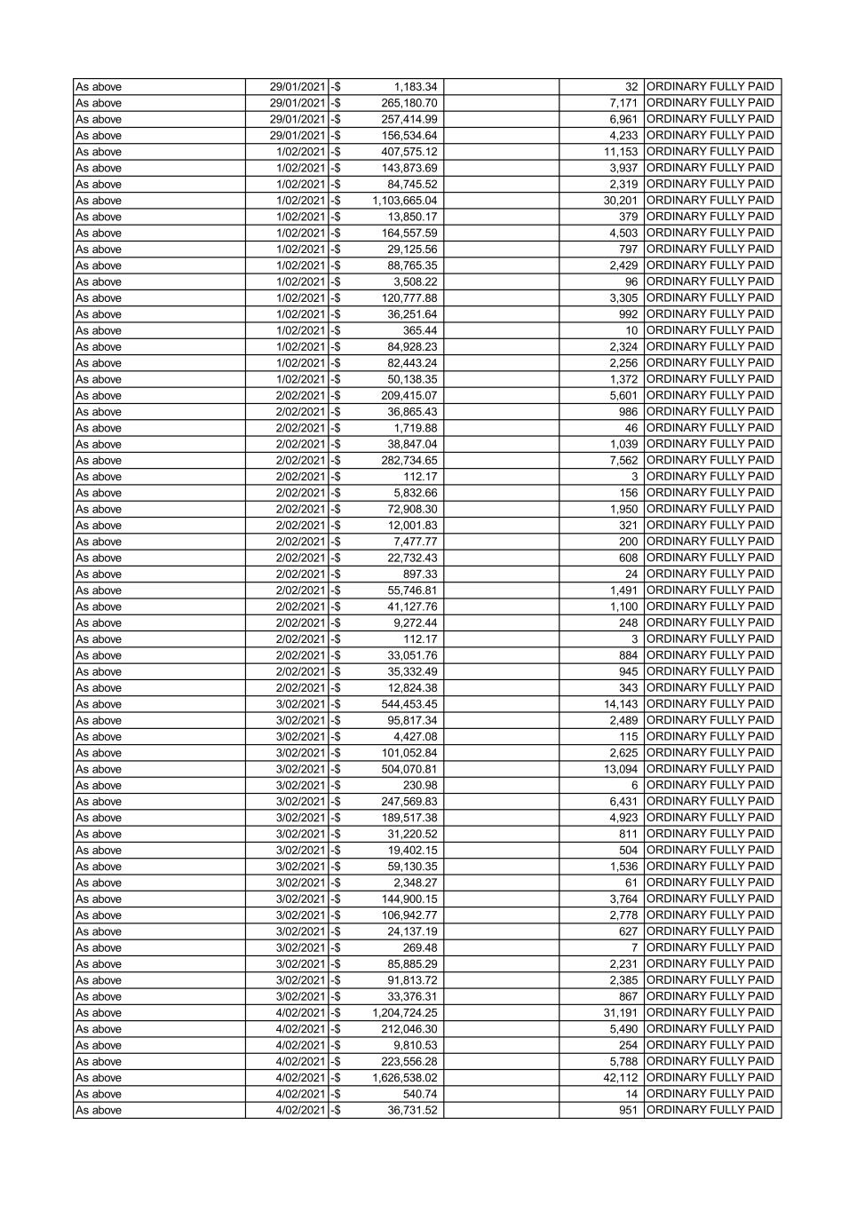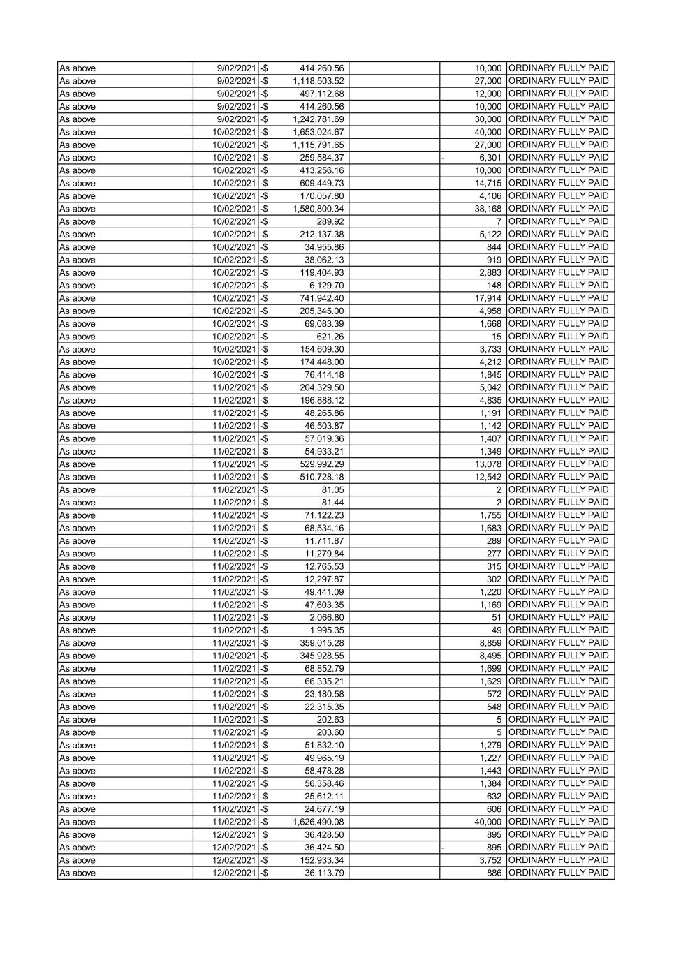 As above 9/02/2021 414,260.56-$ 10,000 ORDINARY FULLY PAID As above 9/02/2021 1,118,503.52-$ 27,000 ORDINARY FULLY PAID As above 9/02/2021 497,112.68-$ 12,000 ORDINARY FULLY PAID As above 9/02/2021 414,260.56-$ 10,000 ORDINARY FULLY PAID As above 9/02/2021 1,242,781.69-$ 30,000 ORDINARY FULLY PAID As above 10/02/2021 1,653,024.67-$ 40,000 ORDINARY FULLY PAID As above 10/02/2021 1,115,791.65-$ 27,000 ORDINARY FULLY PAID As above 10/02/2021 259,584.37-$ 6,301- ORDINARY FULLY PAID As above 10/02/2021 413,256.16-$ 10,000 ORDINARY FULLY PAID As above 10/02/2021 609,449.73-$ 14,715 ORDINARY FULLY PAID As above 10/02/2021 170,057.80-$ 4,106 ORDINARY FULLY PAID As above 10/02/2021 1,580,800.34-$ 38,168 ORDINARY FULLY PAID As above 10/02/2021 289.92-$ 7 ORDINARY FULLY PAID As above 10/02/2021 212,137.38-$ 5,122 ORDINARY FULLY PAID As above 10/02/2021 34,955.86-$ 844 ORDINARY FULLY PAID As above 10/02/2021 38,062.13-$ 919 ORDINARY FULLY PAID As above 10/02/2021 119,404.93-$ 2,883 ORDINARY FULLY PAID As above 10/02/2021 6,129.70-$ 148 ORDINARY FULLY PAID As above 10/02/2021 741,942.40-$ 17,914 ORDINARY FULLY PAID As above 10/02/2021 205,345.00-$ 4,958 ORDINARY FULLY PAID As above 10/02/2021 69,083.39-$ 1,668 ORDINARY FULLY PAID As above 10/02/2021 621.26-$ 15 ORDINARY FULLY PAID As above 10/02/2021 154,609.30-$ 3,733 ORDINARY FULLY PAID As above 10/02/2021 174,448.00-$ 4,212 ORDINARY FULLY PAID As above 10/02/2021 76,414.18-$ 1,845 ORDINARY FULLY PAID As above 11/02/2021 204,329.50-$ 5,042 ORDINARY FULLY PAID As above 11/02/2021 196,888.12-$ 4,835 ORDINARY FULLY PAID As above 11/02/2021 48,265.86-$ 1,191 ORDINARY FULLY PAID As above 11/02/2021 46,503.87-$ 1,142 ORDINARY FULLY PAID As above 11/02/2021 57,019.36-$ 1,407 ORDINARY FULLY PAID As above 11/02/2021 54,933.21-$ 1,349 ORDINARY FULLY PAID As above 11/02/2021 529,992.29-$ 13,078 ORDINARY FULLY PAID As above 11/02/2021 510,728.18-$ 12,542 ORDINARY FULLY PAID As above 11/02/2021 81.05-$ 2 ORDINARY FULLY PAID As above 11/02/2021 81.44-$ 2 ORDINARY FULLY PAID As above 11/02/2021 71,122.23-$ 1,755 ORDINARY FULLY PAID As above 11/02/2021 68,534.16-$ 1,683 ORDINARY FULLY PAID As above 11/02/2021 11,711.87-$ 289 ORDINARY FULLY PAID As above 11/02/2021 11,279.84-$ 277 ORDINARY FULLY PAID As above 11/02/2021 12,765.53-$ 315 ORDINARY FULLY PAID As above 11/02/2021 12,297.87-$ 302 ORDINARY FULLY PAID As above 11/02/2021 49,441.09-$ 1,220 ORDINARY FULLY PAID As above 11/02/2021 47,603.35-$ 1,169 ORDINARY FULLY PAID As above 11/02/2021 2,066.80-$ 51 ORDINARY FULLY PAID As above 11/02/2021 1,995.35-$ 49 ORDINARY FULLY PAID As above 11/02/2021 359,015.28-$ 8,859 ORDINARY FULLY PAID As above 11/02/2021 345,928.55-$ 8,495 ORDINARY FULLY PAID As above 11/02/2021 68,852.79-$ 1,699 ORDINARY FULLY PAID As above 11/02/2021 66,335.21-$ 1,629 ORDINARY FULLY PAID As above 11/02/2021 23,180.58-$ 572 ORDINARY FULLY PAID As above 11/02/2021 22,315.35-$ 548 ORDINARY FULLY PAID As above 11/02/2021 202.63-$ 5 ORDINARY FULLY PAID As above 11/02/2021 203.60-$ 5 ORDINARY FULLY PAID As above 11/02/2021 51,832.10-$ 1,279 ORDINARY FULLY PAID As above 11/02/2021 49,965.19-$ 1,227 ORDINARY FULLY PAID As above 11/02/2021 58,478.28-$ 1,443 ORDINARY FULLY PAID As above 11/02/2021 56,358.46-$ 1,384 ORDINARY FULLY PAID As above 11/02/2021 25,612.11-$ 632 ORDINARY FULLY PAID As above 11/02/2021 24,677.19-$ 606 ORDINARY FULLY PAID As above 11/02/2021 1,626,490.08-$ 40,000 ORDINARY FULLY PAID As above 12/02/2021 36,428.50$ 895 ORDINARY FULLY PAID As above 12/02/2021 36,424.50-$ 895- ORDINARY FULLY PAID As above 12/02/2021 152,933.34-$ 3,752 ORDINARY FULLY PAID As above 12/02/2021 36,113.79-$ 886 ORDINARY FULLY PAID